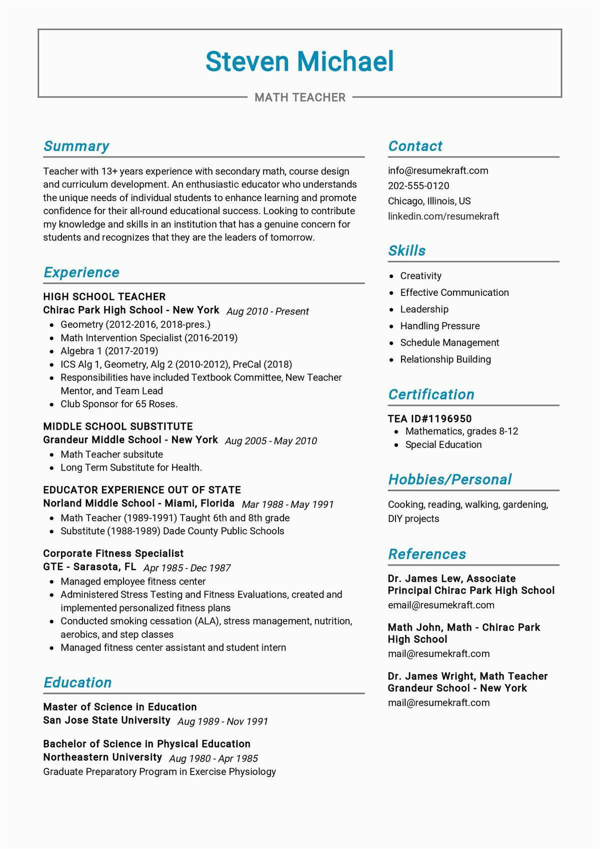 Math Teacher Resume Sample ResumeKraft