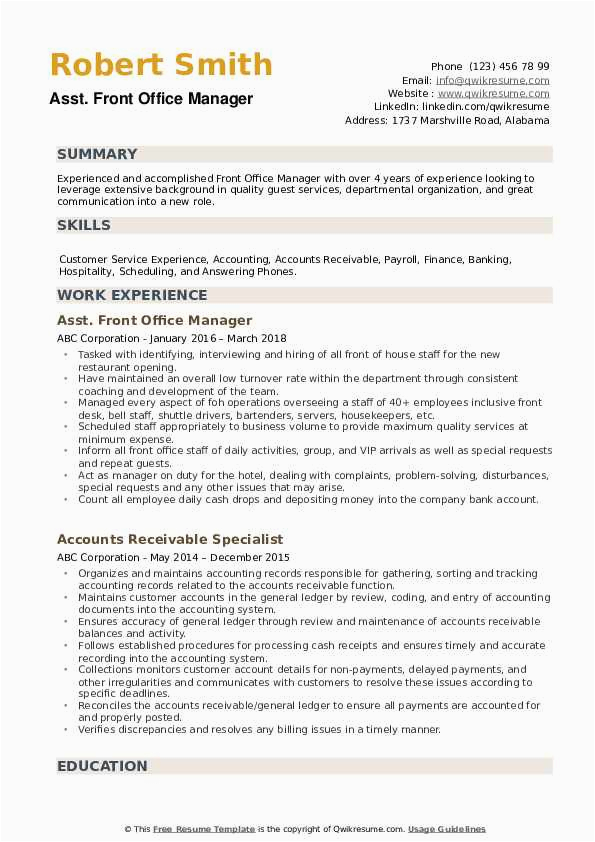 as soon as you are searching for the absolute job, you will of course want to put your best foot deal with once an impressive and well-formatted resume. One pretension of assuring that you have such a resume is to download a front office duty manager resume sample. These templates can come up with the money for you behind the truthful resume you are looking for or suitably use them as a lead to make your own.