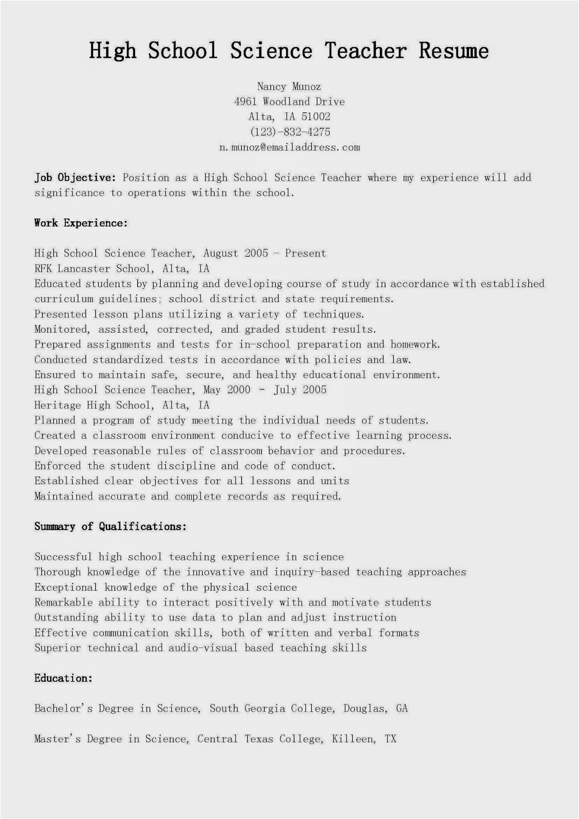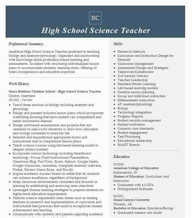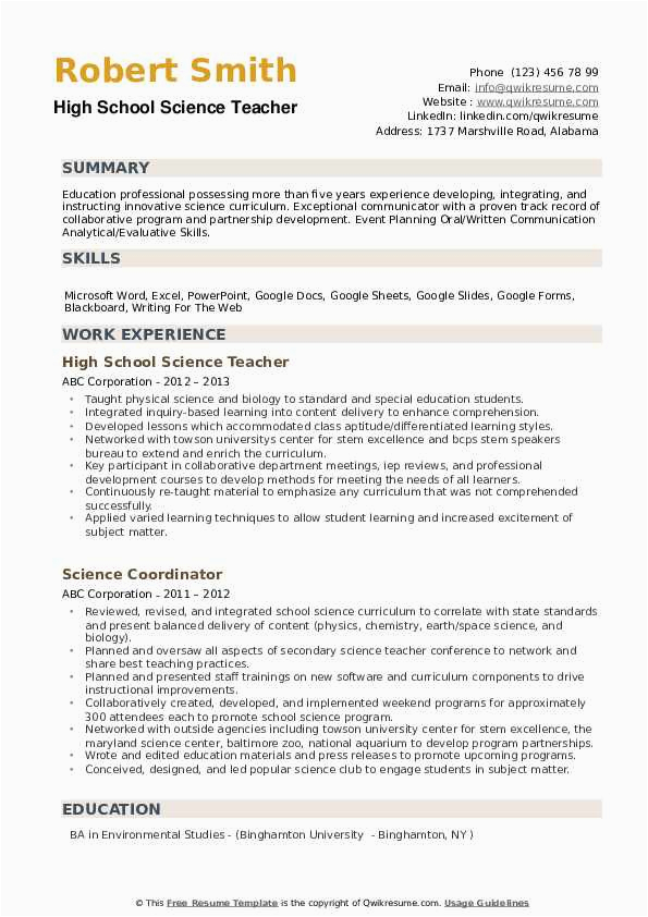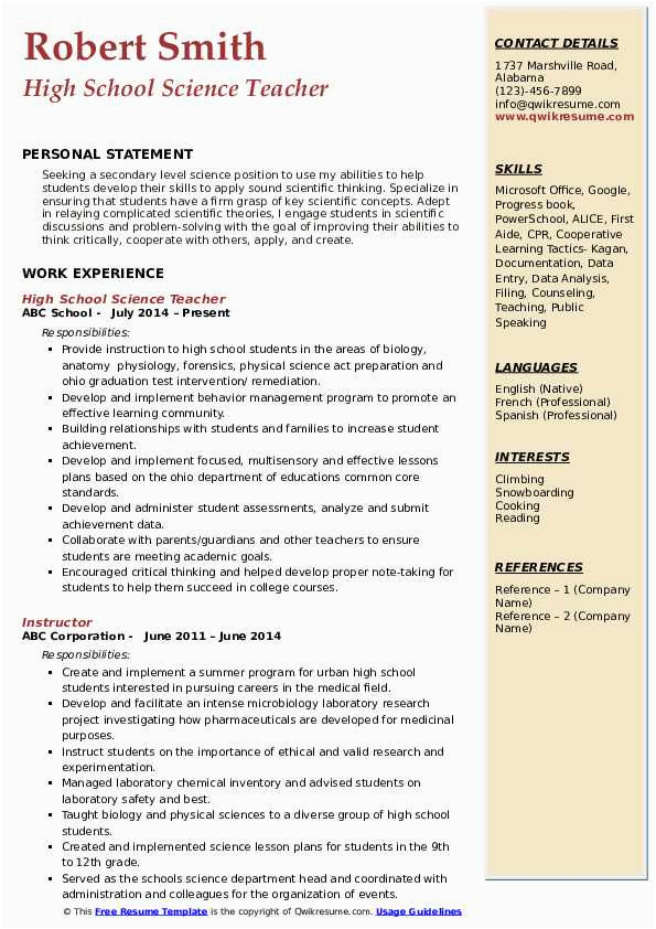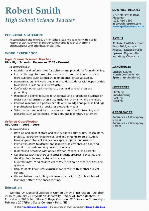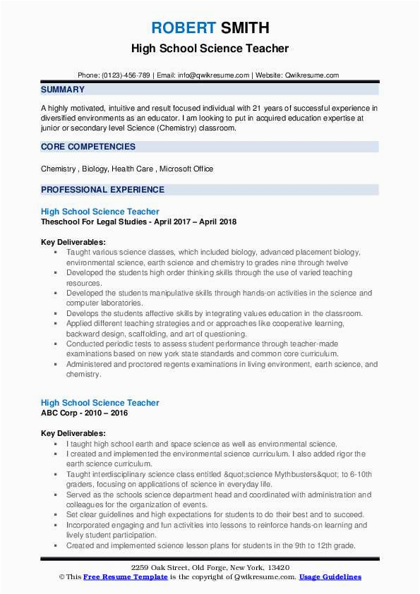 Bearing in mind you are searching for the absolute job, you will of course want to put your best foot attend to behind an fabulous and well-formatted resume. One mannerism of assuring that you have such a resume is to download a high school science teacher resume samples. These templates can provide you taking into account the exact resume you are looking for or comprehensibly use them as a lead to create your own.