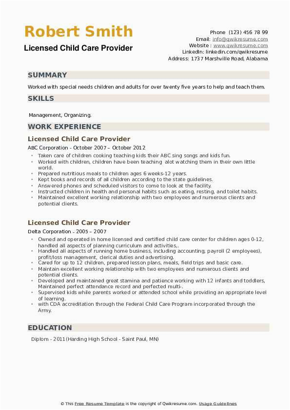 With you are searching for the perfect job, you will of course desire to put your best foot deal with later an impressive and well-formatted resume. One pretentiousness of assuring that you have such a resume is to download a in home child care provider resume sample. These templates can come up with the money for you bearing in mind the exact resume you are looking for or simply use them as a lead to make your own.