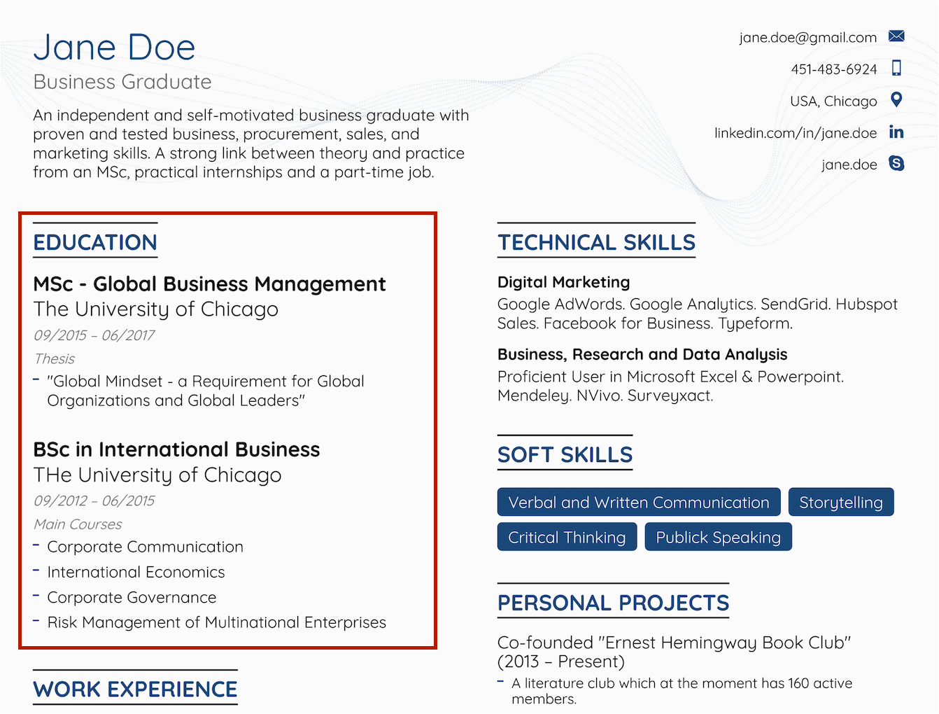 However, if you are a new graduate, you will want to list your intellectual achievements at the top of the page, and later list your employment archives and accomplishments.