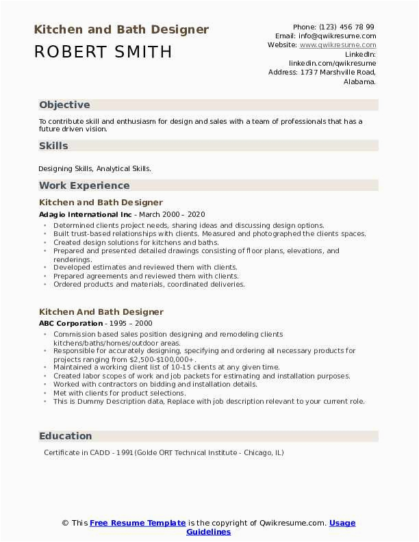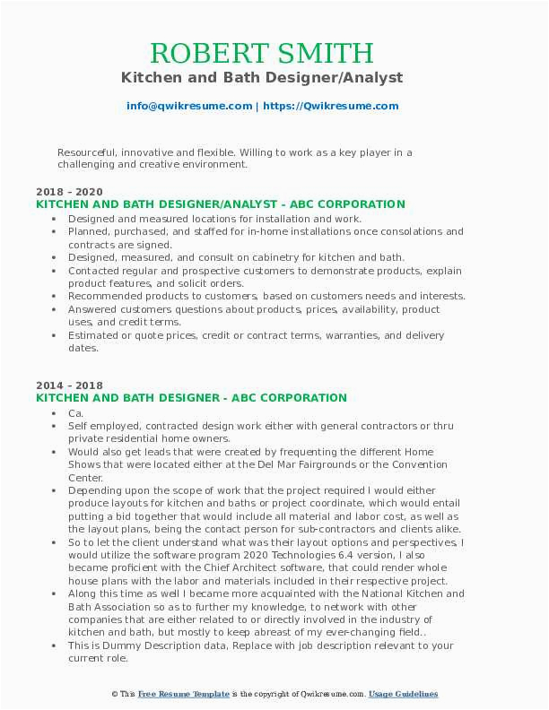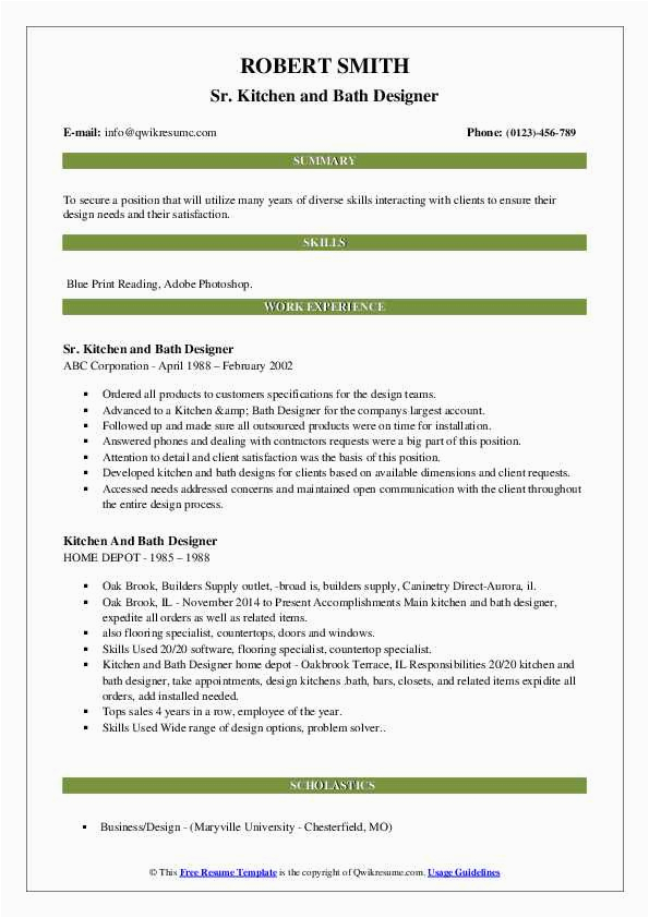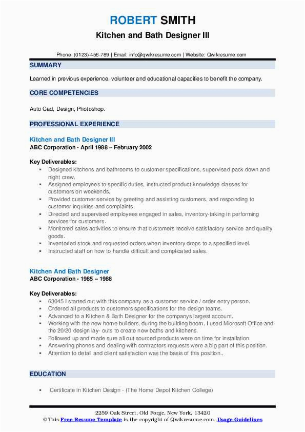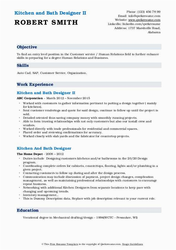 Subsequent to you are searching for the perfect job, you will of course desire to put your best foot refer following an impressive and well-formatted resume. One pretension of assuring that you have such a resume is to download a Kitchen and Bath Designer Resume Sample. These templates can offer you similar to the exact resume you are looking for or suitably use them as a lead to create your own.