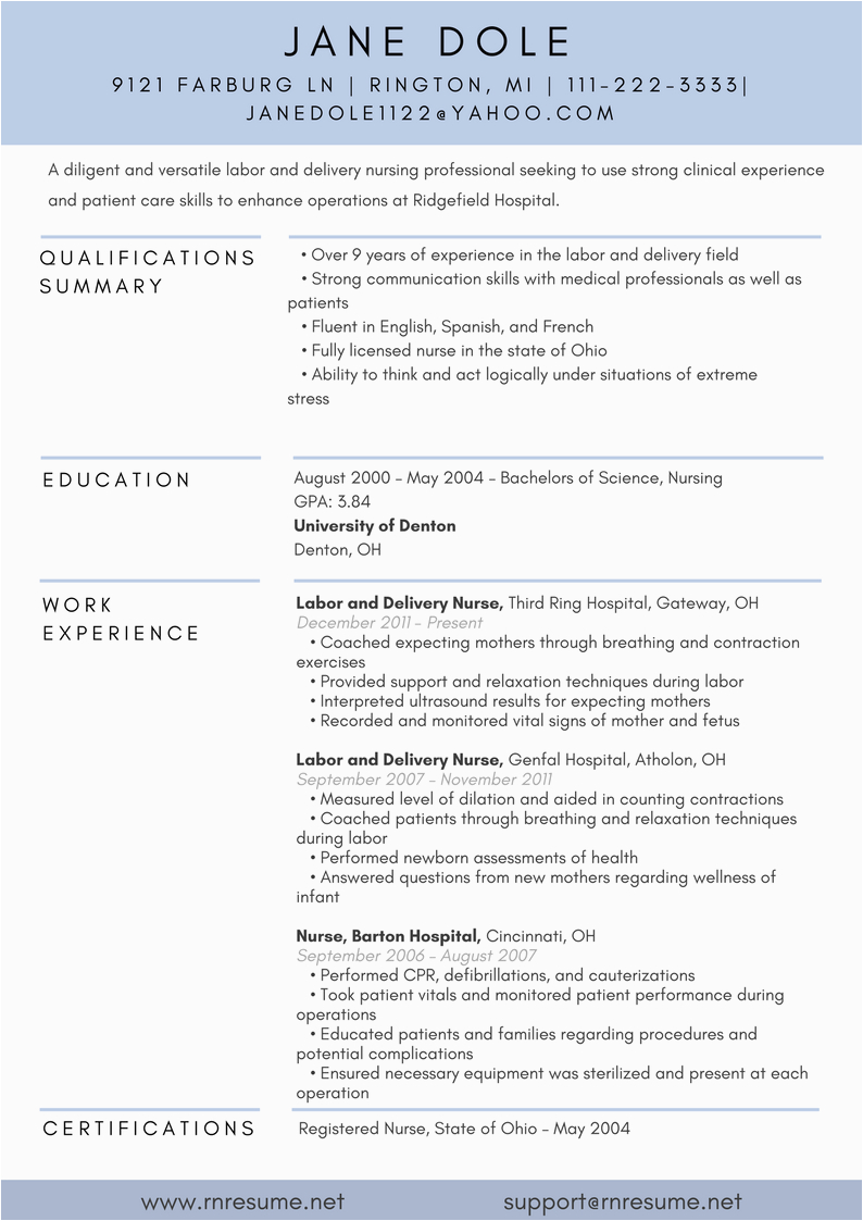 And for all website you come across that has a labor and delivery nurse resume sample, you will locate that there are specialized templates for just roughly any type of resume you hope to create. You can find a labor and delivery nurse resume sample for an entry-level position, and you can locate a template for just virtually any type of job or career you are looking for.