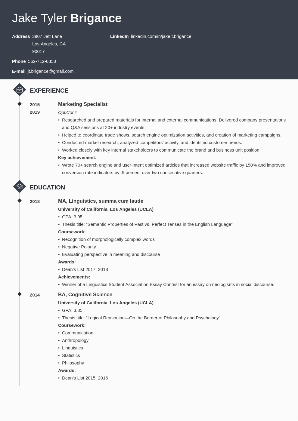 However, if you are a new graduate, you will desire to list your speculative achievements at the top of the page, and next list your employment history and accomplishments.
