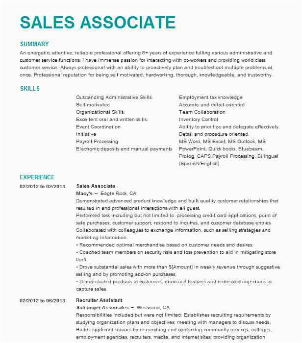 And for all website you come across that has a macy s sales associate resume sample, you will locate that there are specialized templates for just approximately any type of resume you wish to create. You can locate a macy s sales associate resume sample for an entry-level position, and you can find a template for just roughly any type of job or career you are looking for.