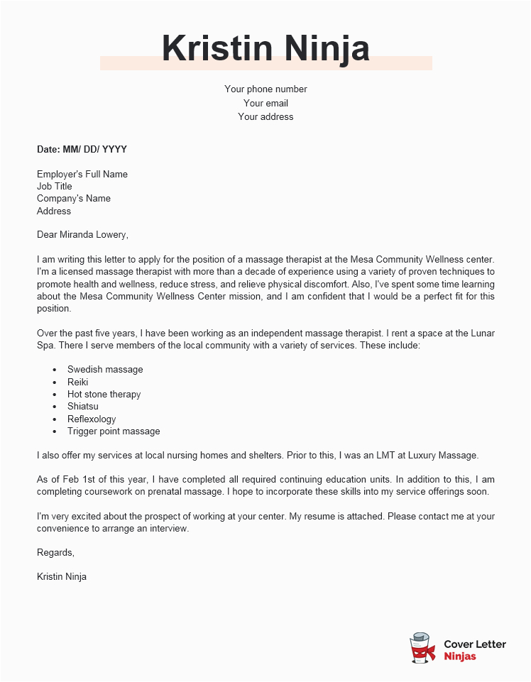 Massage Therapist Cover Letter Example Cover Letter Ninjas