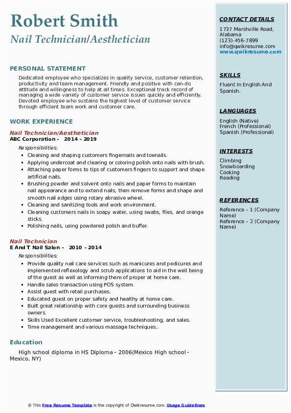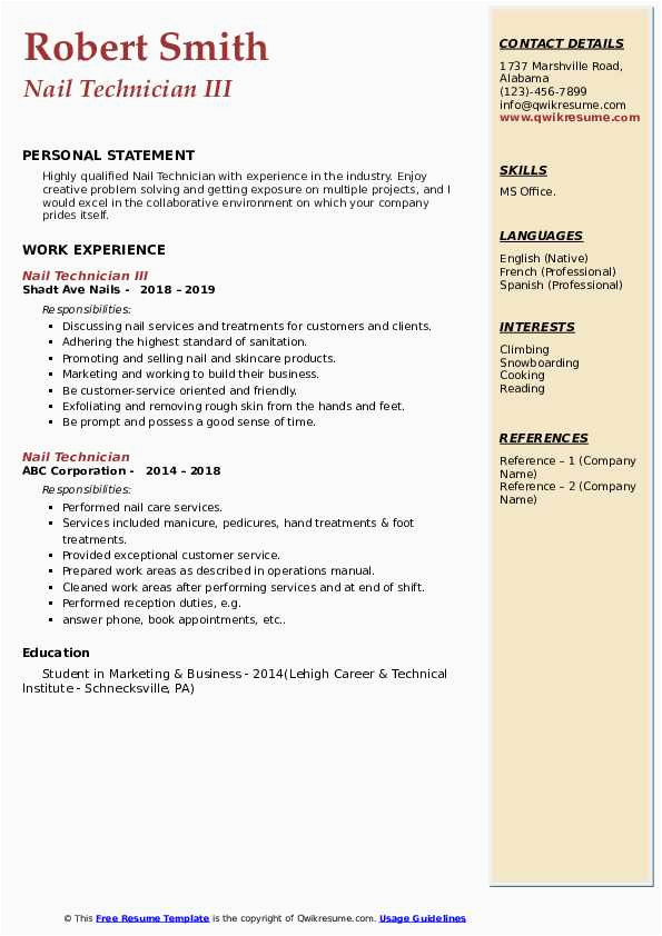 Bearing in mind you are searching for the perfect job, you will of course want to put your best foot adopt bearing in mind an fabulous and well-formatted resume. One artifice of assuring that you have such a resume is to download a nail technician resume cover letter sample. These templates can give you gone the truthful resume you are looking for or straightforwardly use them as a lead to make your own.