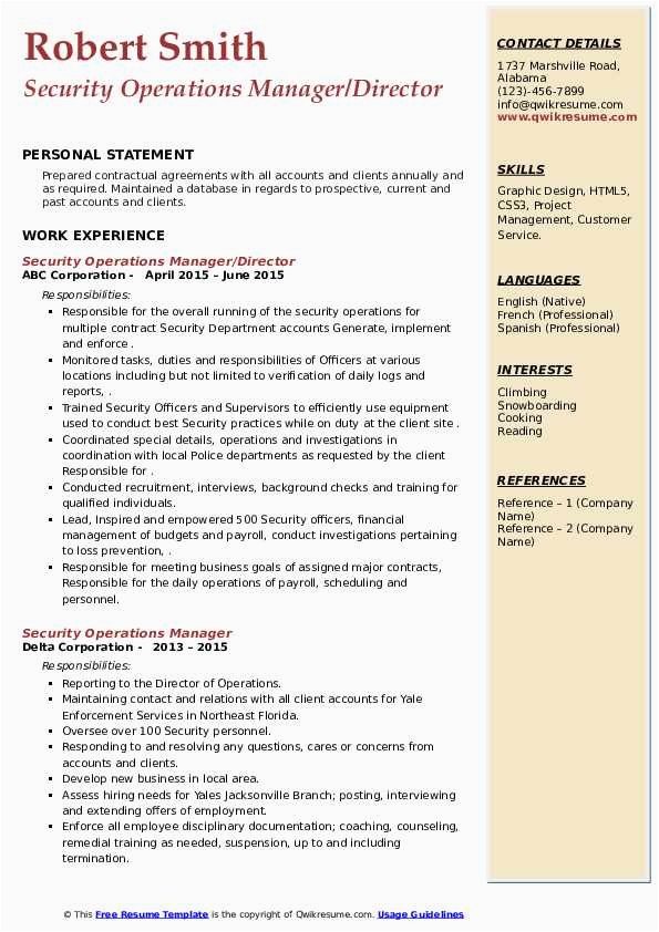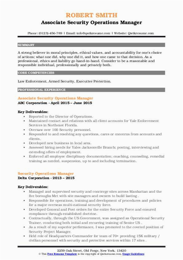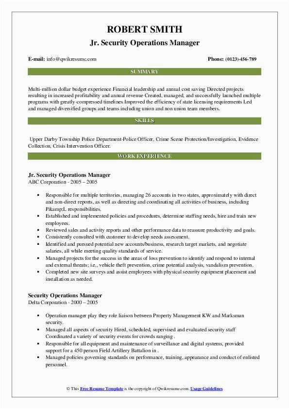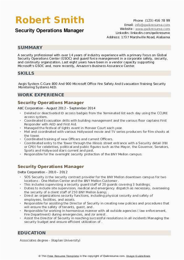 Operations Manager for Security Company Sample Resume Security Operations Manager Resume Samples and all other pictures, designs or photos on our website are copyright of their respective owners. we get our pictures from another websites, search engines and other sources to use as an inspiration for you. please contact us if you think we are infringing copyright of your pictures using contact page. we will be very happy to help you.