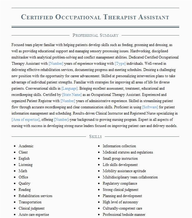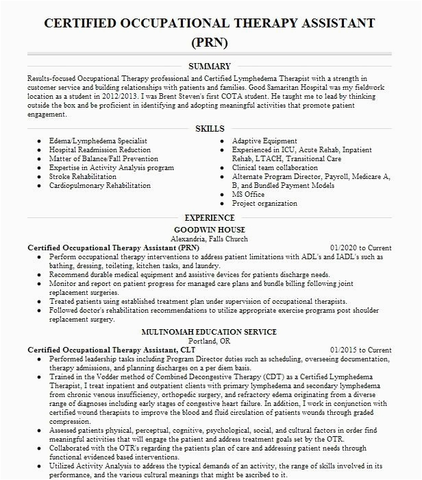 Prn Occupational therapy assistant Resume Sample Occupational therapy assistant Resume Samples and all other pictures, designs or photos on our website are copyright of their respective owners. we get our pictures from another websites, search engines and other sources to use as an inspiration for you. please contact us if you think we are infringing copyright of your pictures using contact page. we will be very happy to help you.