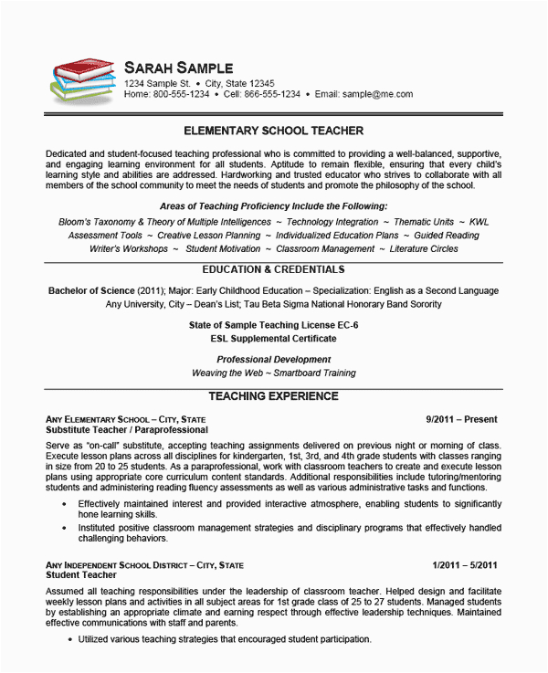 Elementary School Teacher Resume Example Sample