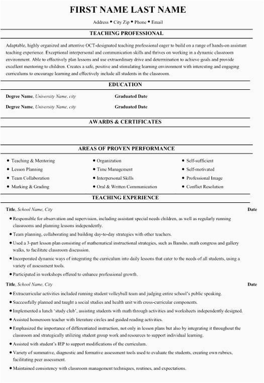 Sample Resume for assistant Teacher In Preschools