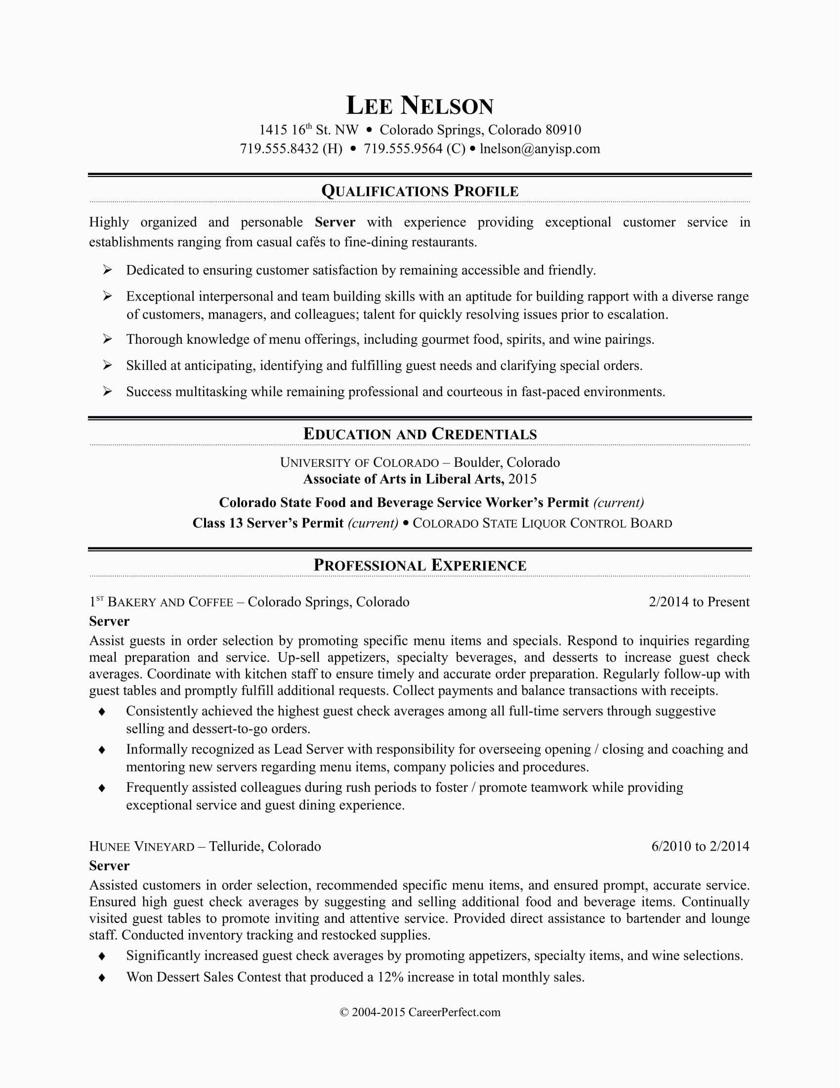 Do you have a friend or relative who has a job you idolize and a good grasp of how to format and create a resume? Why not question them to look the resume that they used, and use that for your restaurant server job description resume sample?