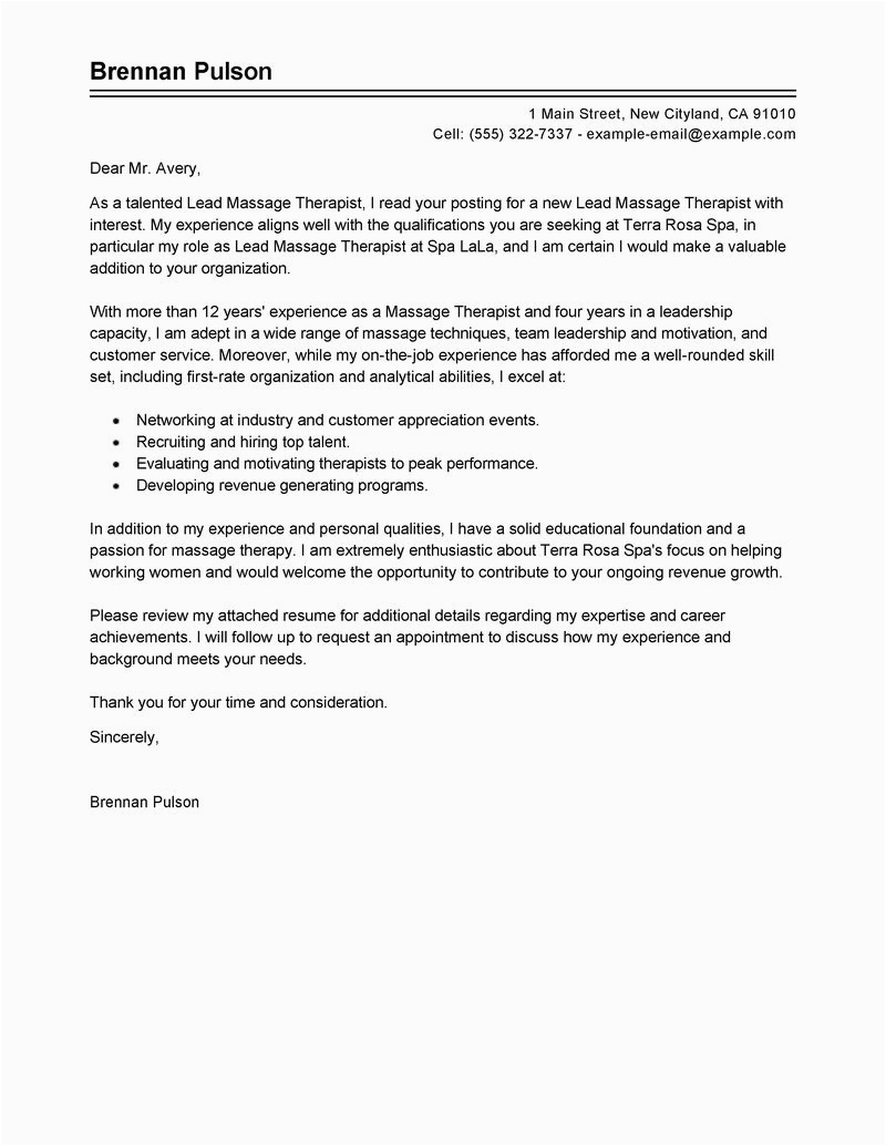 However, these are not your forlorn options for locating resume cover letter samples for massage therapist. Your moot or university will most assuredly have more than one resume template that you can use, and will be glad to incite you. handily head on top of to their Placement Office and you will have a template in no time. After all, it is their job to help you find employment, and past you are booming and a satisfied and usefully employed former student, it is plus a feather in their cap.