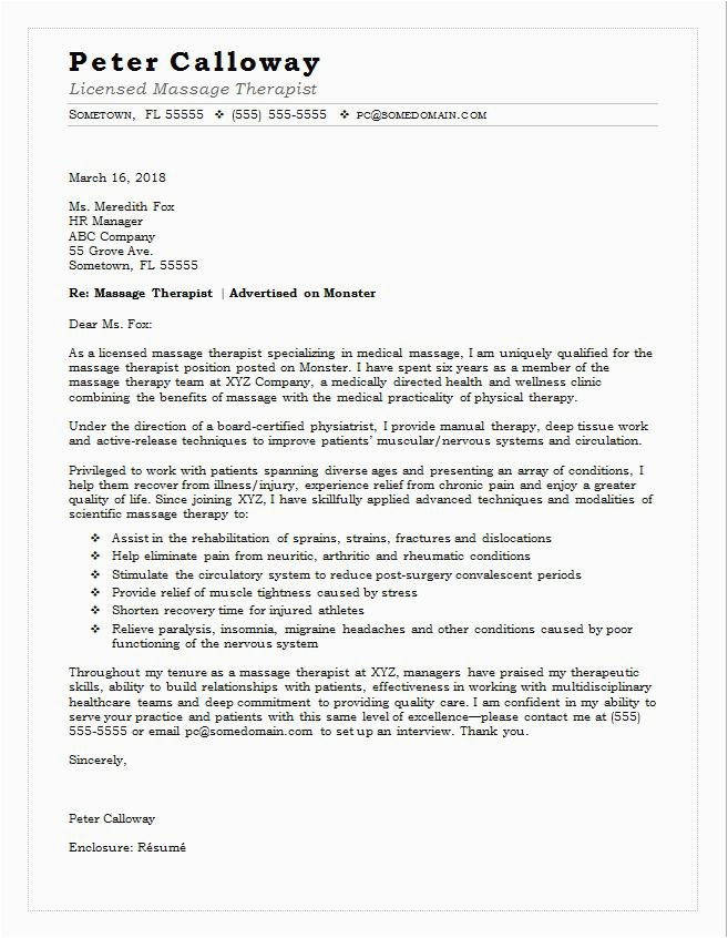 You could as well as download a template from the Internet; there are an abundance of websites where you will be practiced to find a resume cover letter samples for massage therapist, either to suitably peruse or to download and use.