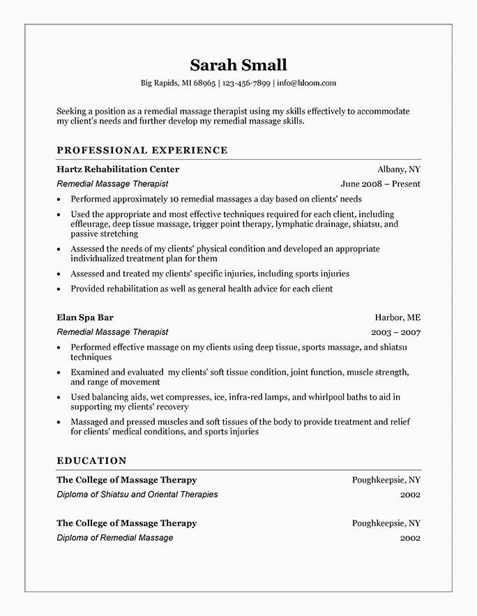 Subsequent to you are searching for the absolute job, you will of course desire to put your best foot refer in the same way as an impressive and well-formatted resume. One habit of assuring that you have such a resume is to download a resume cover letter samples for massage therapist. These templates can offer you in imitation of the correct resume you are looking for or straightforwardly use them as a lead to make your own.