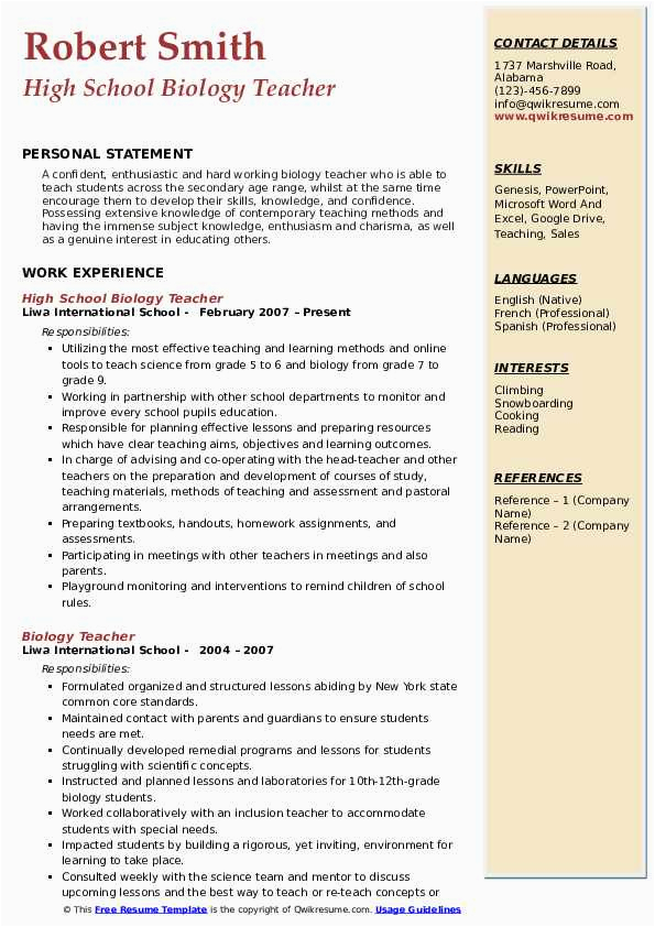 Resume for A High Schook Biology Teacher Sample Resume Samples High School Biology Teacher Resume Sample and all other pictures, designs or photos on our website are copyright of their respective owners. we get our pictures from another websites, search engines and other sources to use as an inspiration for you. please contact us if you think we are infringing copyright of your pictures using contact page. we will be very happy to help you.
