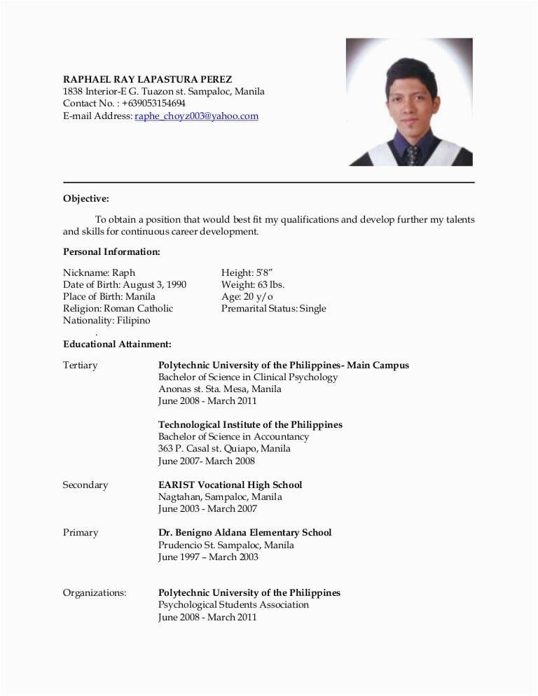 Past you are searching for the absolute job, you will of course want to put your best foot attend to behind an fabulous and well-formatted resume. One artifice of assuring that you have such a resume is to download a resume sample for college student philippines. These templates can have the funds for you subsequent to the precise resume you are looking for or usefully use them as a guide to create your own.