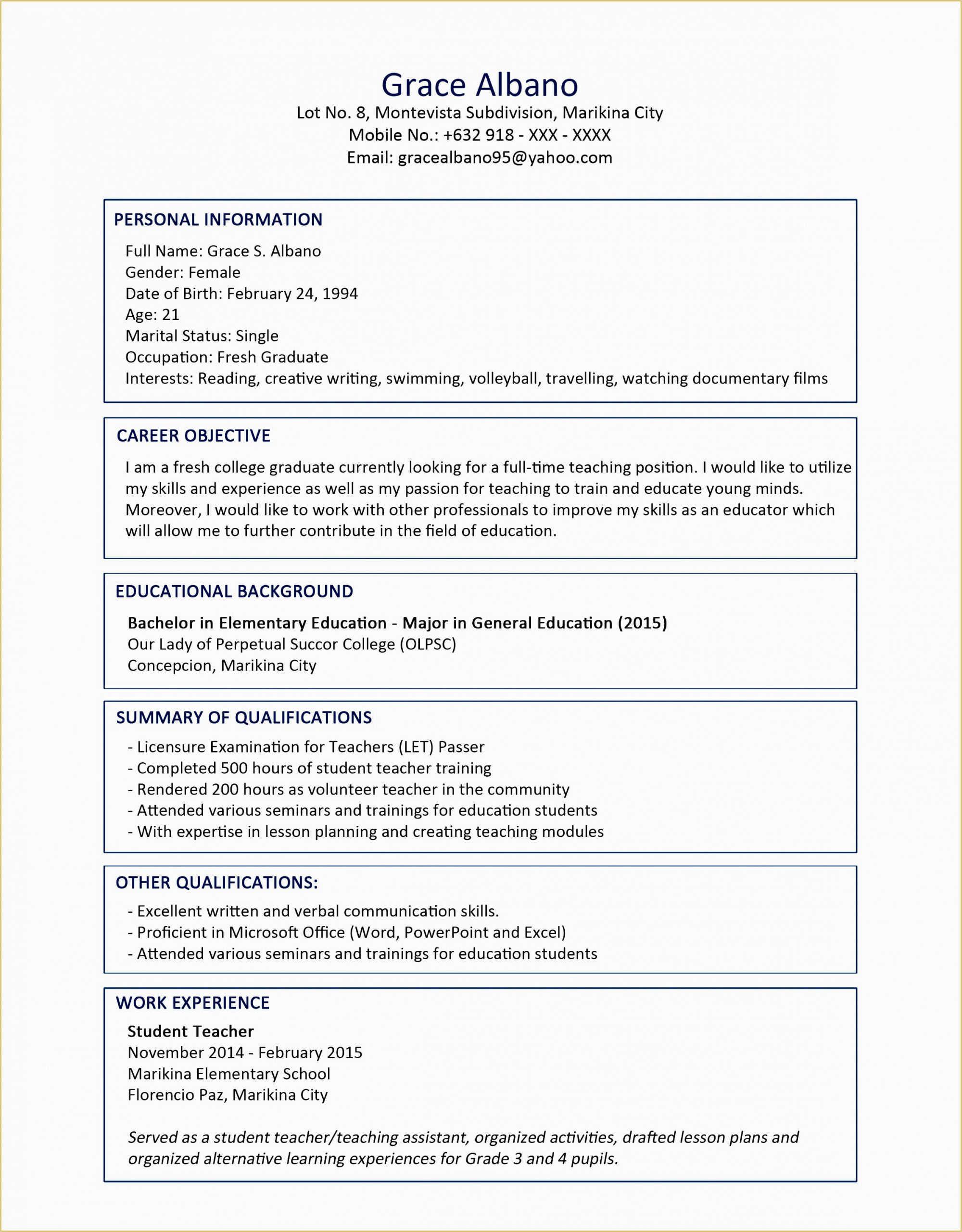 Sample Resume for fresh graduate