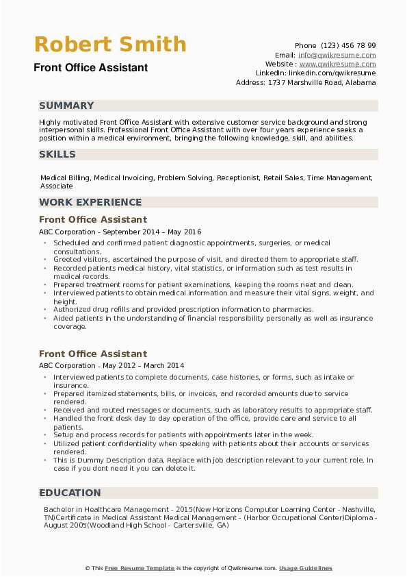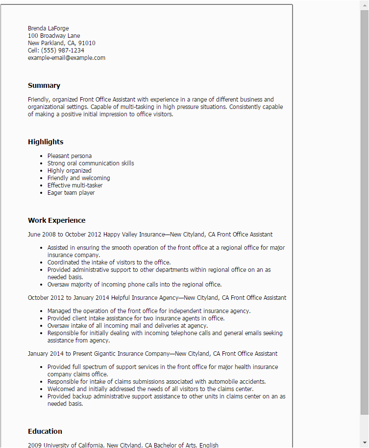 However, these are not your without help options for locating resume samples for front office position. Your learned or academic circles will most assuredly have more than one resume template that you can use, and will be glad to help you. simply head over to their Placement Office and you will have a template in no time. After all, it is their job to assist you locate employment, and afterward you are flourishing and a satisfied and expediently employed former student, it is with a feather in their cap.