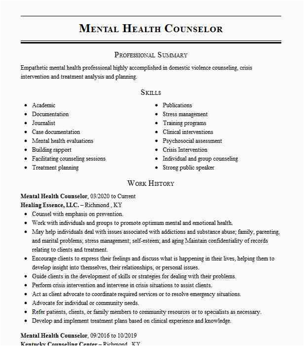 There are therefore many options for you as you search for the absolute resume samples for mental health counselors, and with some difficult do something and perseverance upon your part, you will find yourself taking into account a first-class resume in no time, and hopefully, a first-class employer, as well!. For more guidance on resumes or for a resume samples for mental health counselors checkout this recommended websites.
