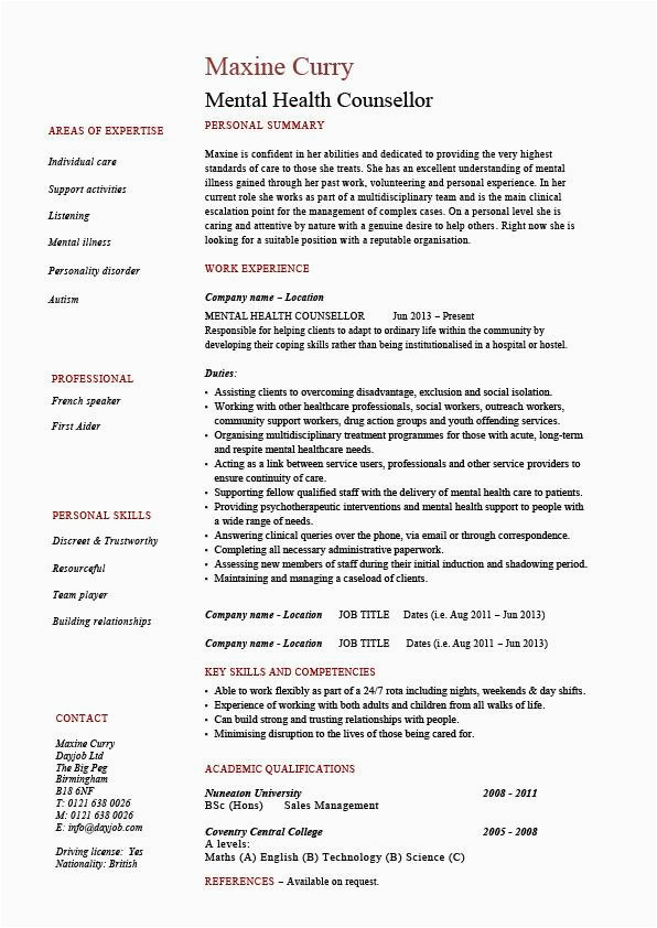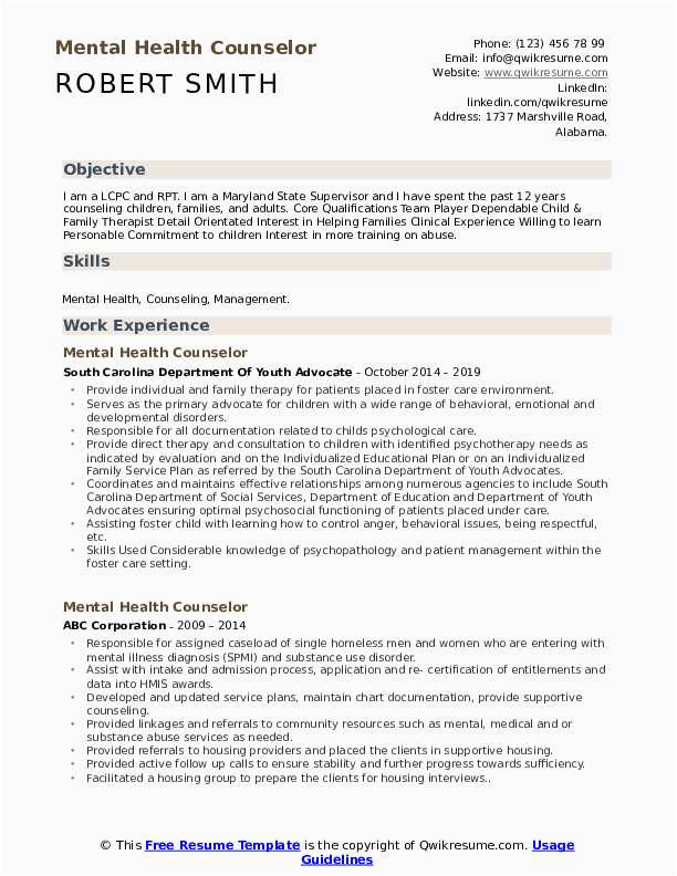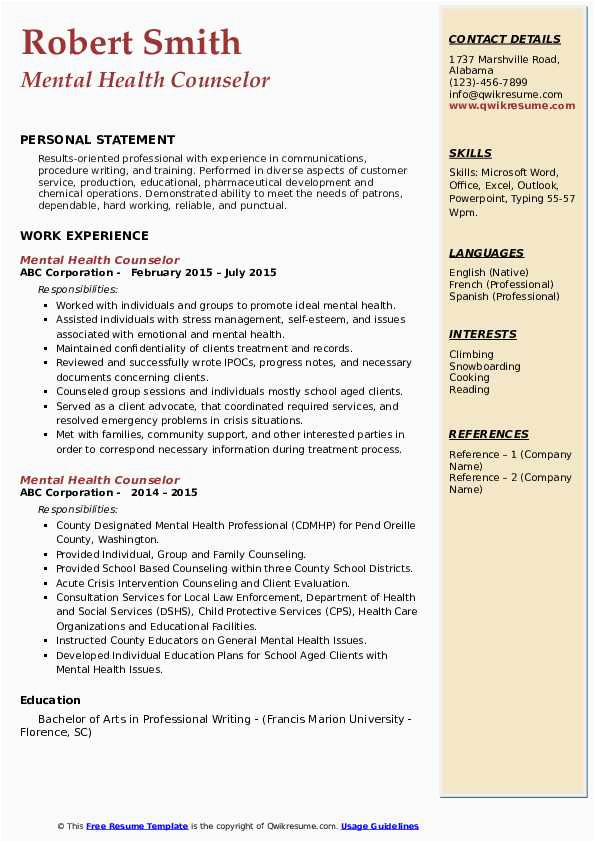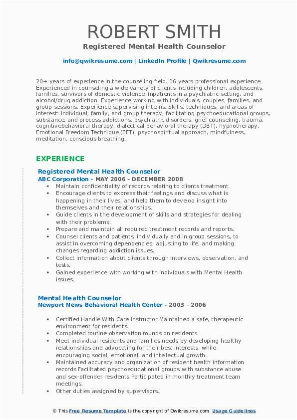 in imitation of you are searching for the absolute job, you will of course want to put your best foot talk to considering an fabulous and well-formatted resume. One quirk of assuring that you have such a resume is to download a resume samples for mental health counselors. These templates can find the money for you similar to the precise resume you are looking for or usefully use them as a lead to create your own.