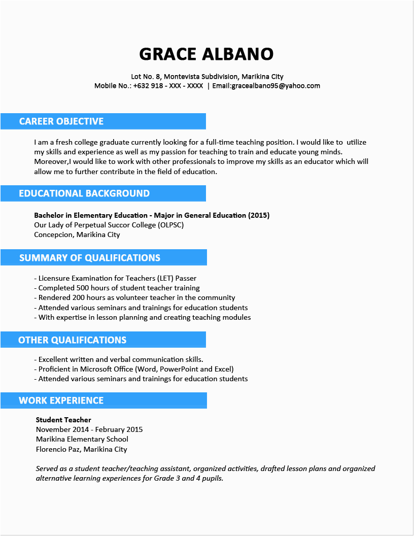 Sample Resume for Fresh Graduates
