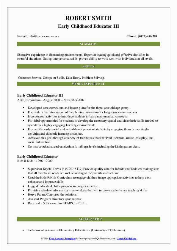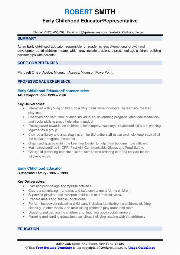 Resume Template for Early Childhood Educator downloads can be a lifesaver in the manner of you see how helpful they can be. The promote of using them are numerous. They keep time, give fine formatting, presentation, and can encourage you announce yourself professionally. The idea of marketing is creating a lasting impression. Your resume markets you!