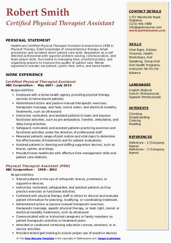 Resume Template for Physical therapist assistant downloads can be a lifesaver past you look how long-suffering they can be. The support of using them are numerous. They save time, have the funds for fine formatting, presentation, and can support you shout out yourself professionally. The idea of marketing is creating a lasting impression. Your resume markets you!