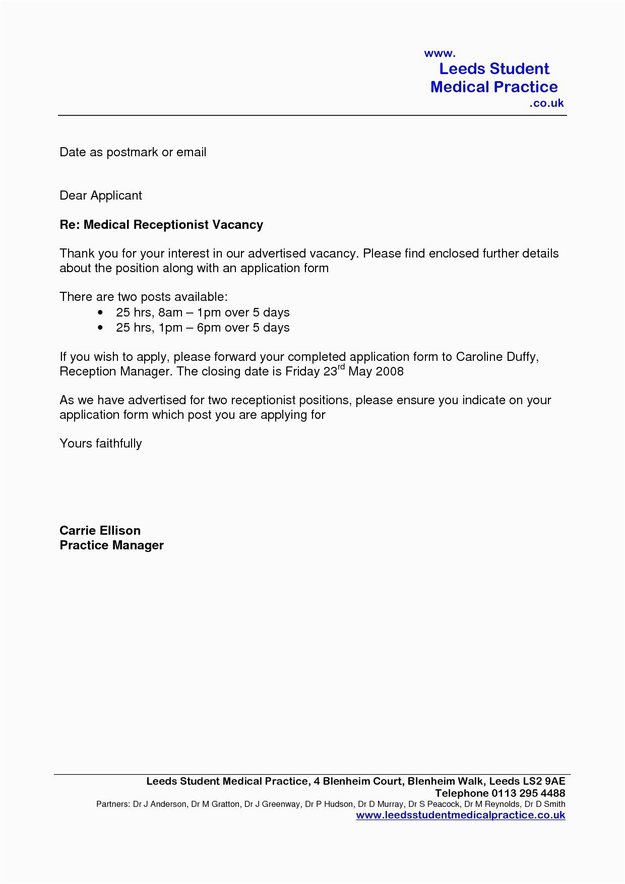 Medical Receptionist Cover Letter
