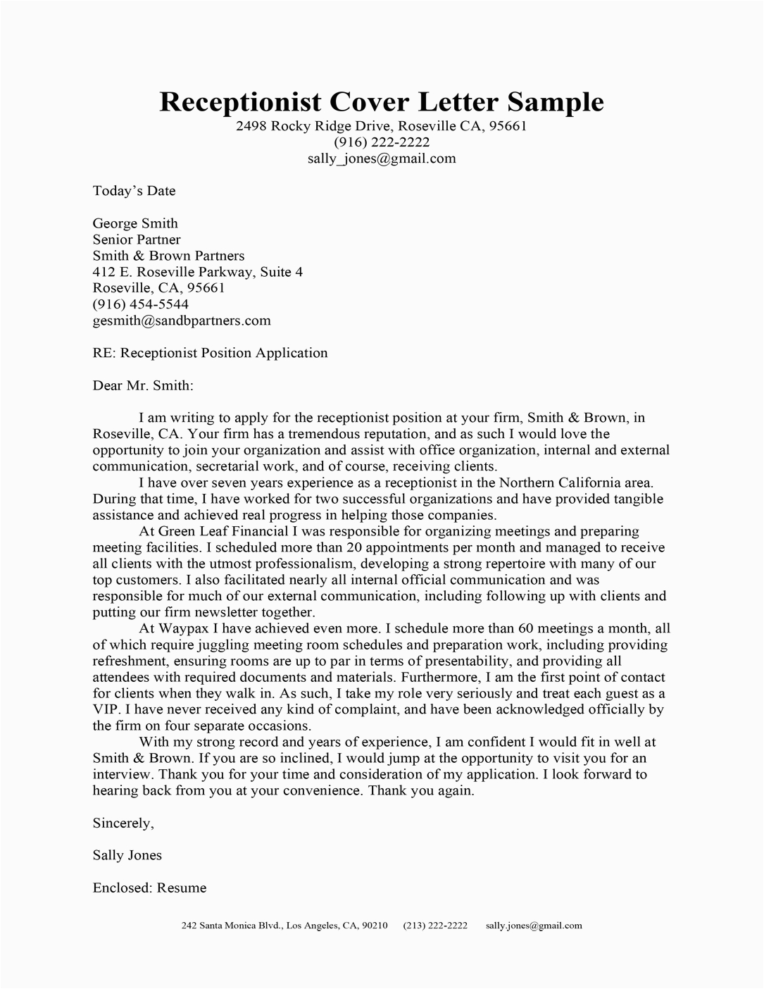 Receptionist Cover Letter Example