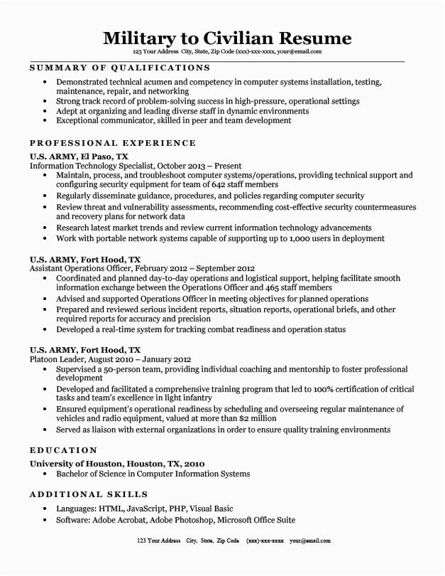 And for every website you arrive across that has a sample military resume for civilian job, you will find that there are specialized templates for just approximately any type of resume you wish to create. You can locate a sample military resume for civilian job for an entry-level position, and you can find a template for just virtually any type of job or career you are looking for.