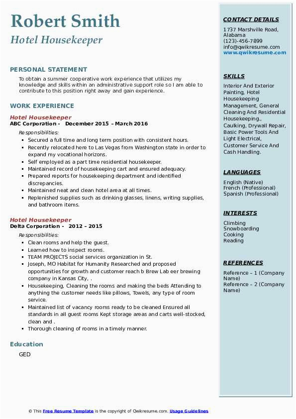 Sample Of Resume for Hotel Housekeeper Hotel Housekeeper Resume and all other pictures, designs or photos on our website are copyright of their respective owners. we get our pictures from another websites, search engines and other sources to use as an inspiration for you. please contact us if you think we are infringing copyright of your pictures using contact page. we will be very happy to help you.