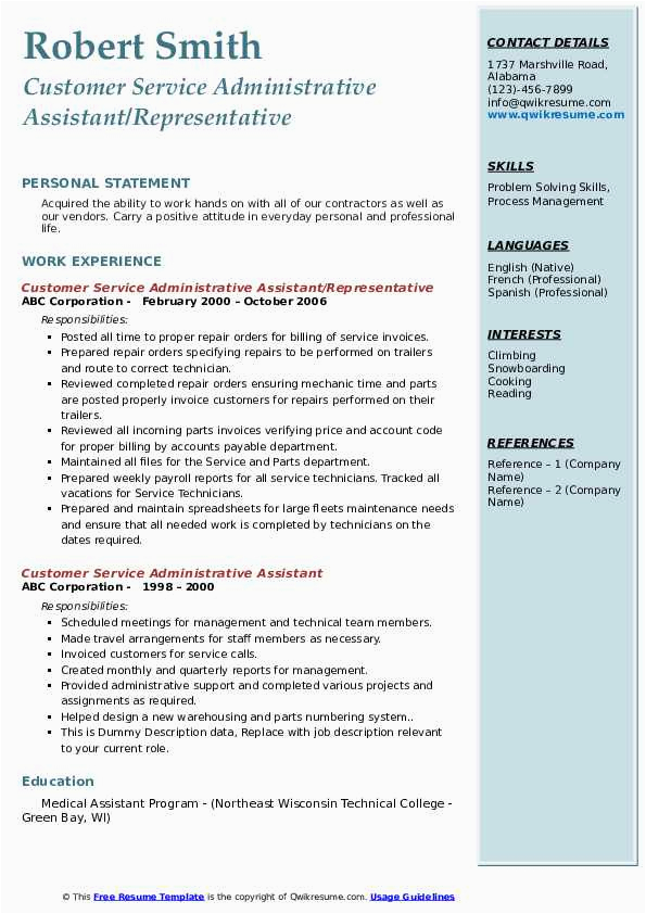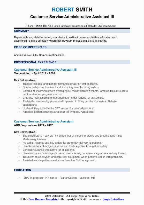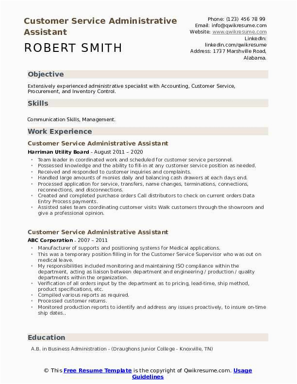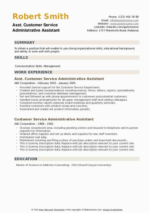 However, these are not your on your own options for locating sample resume administrative assistant customer service. Your instructor or academic world will most assuredly have more than one resume template that you can use, and will be glad to back up you. understandably head exceeding to their Placement Office and you will have a template in no time. After all, it is their job to assist you locate employment, and like you are well-off and a satisfied and expediently employed former student, it is moreover a feather in their cap.