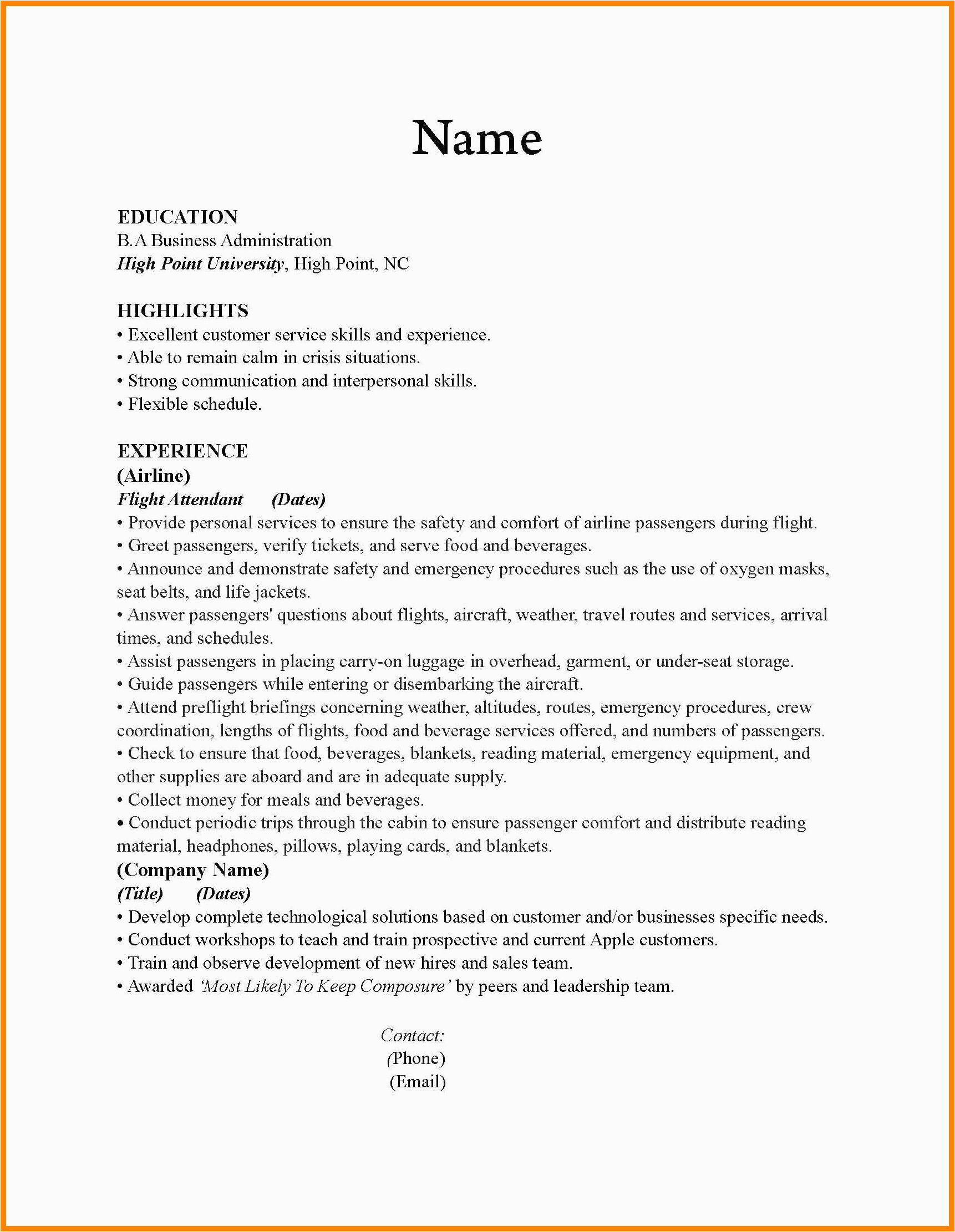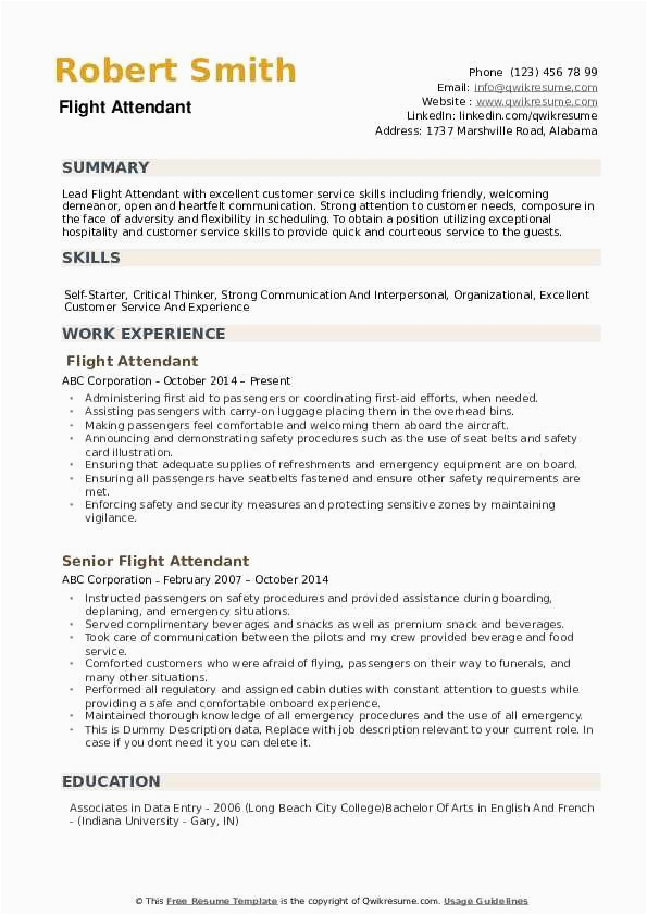 Gone you are searching for the perfect job, you will of course want to put your best foot lecture to later an impressive and well-formatted resume. One mannerism of assuring that you have such a resume is to download a sample resume flight attendant no experience. These templates can manage to pay for you like the true resume you are looking for or handily use them as a lead to create your own.