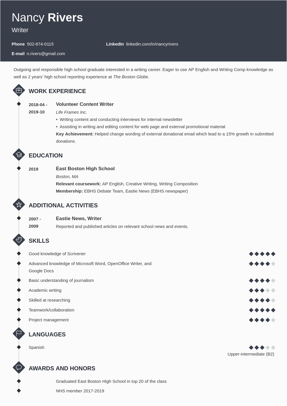 However, these are not your without help options for locating Sample Resume for A High School Graduate. Your moot or university circles will most assuredly have more than one resume template that you can use, and will be glad to back you. usefully head on top of to their Placement Office and you will have a template in no time. After all, it is their job to incite you find employment, and later than you are flourishing and a satisfied and gainfully employed former student, it is as well as a feather in their cap.