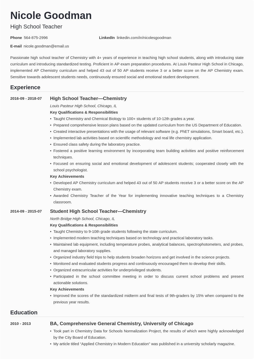 You could next download a template from the Internet; there are an abundance of websites where you will be skilled to locate a Sample Resume for A High School Teacher, either to conveniently peruse or to download and use.