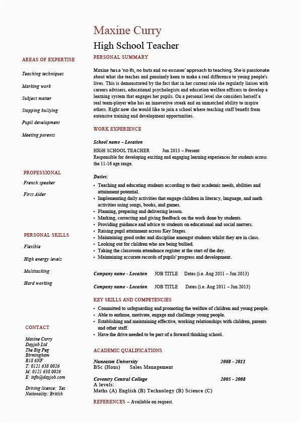 However, these are not your without help options for locating Sample Resume for A High School Teacher. Your university or academic circles will most assuredly have more than one resume template that you can use, and will be happy to incite you. suitably head more than to their Placement Office and you will have a template in no time. After all, it is their job to encourage you find employment, and following you are well-to-do and a satisfied and gainfully employed former student, it is in addition to a feather in their cap.
