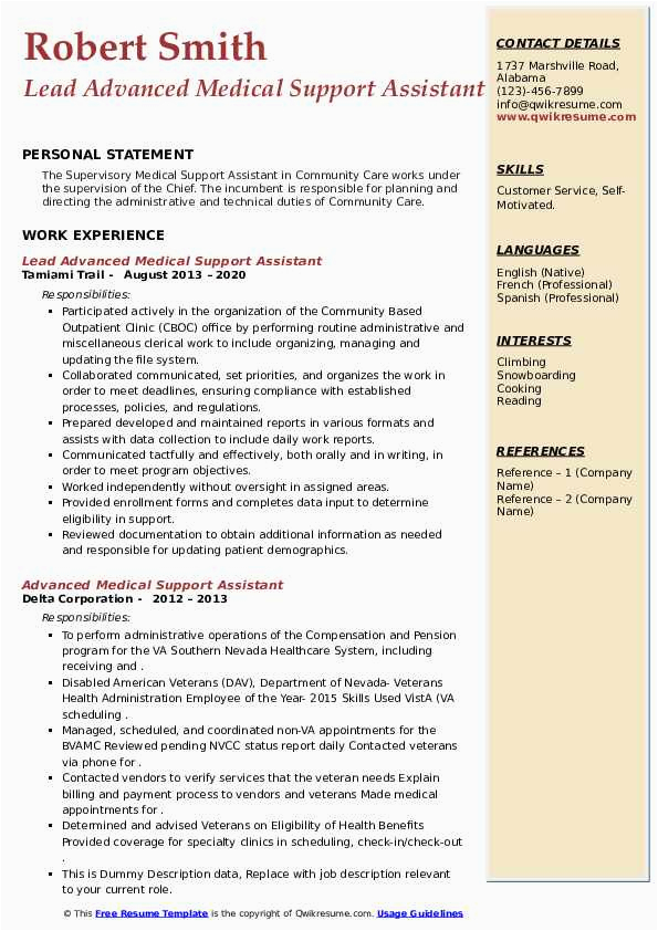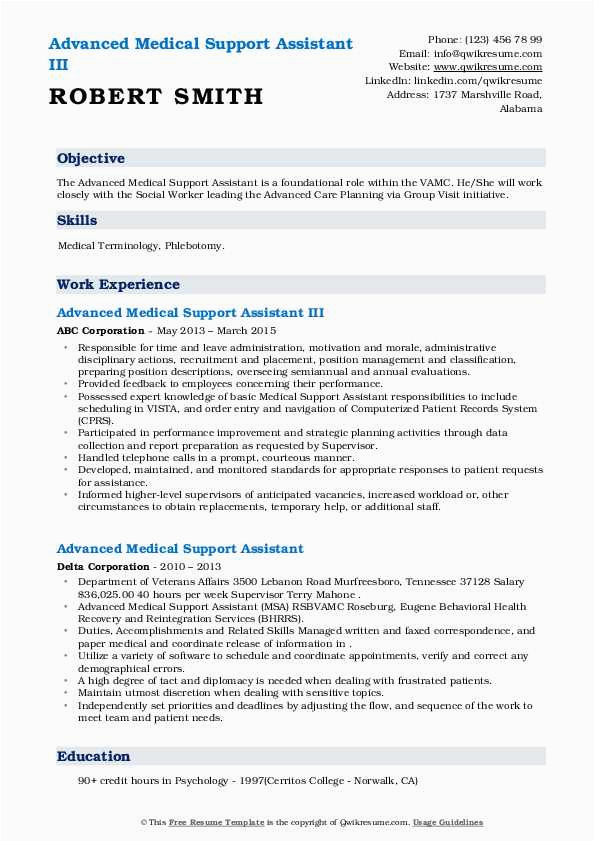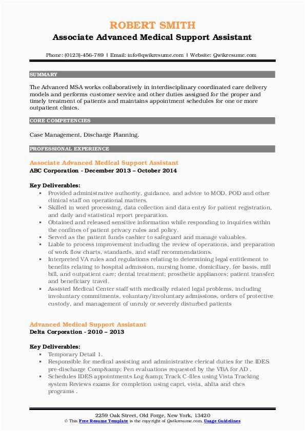 Subsequent to you are searching for the perfect job, you will of course desire to put your best foot forward following an impressive and well-formatted resume. One exaggeration of assuring that you have such a resume is to download a sample resume for advanced medical support assistant. These templates can have enough money you taking into account the true resume you are looking for or helpfully use them as a guide to create your own.