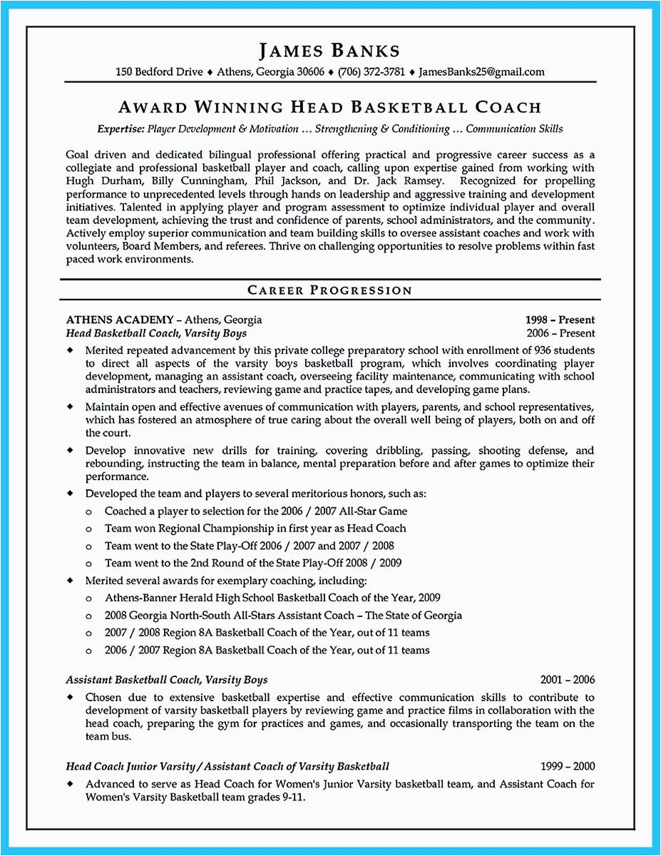 However, these are not your without help options for locating sample resume for basketball coaching position. Your speculative or the academy will most assuredly have more than one resume template that you can use, and will be glad to assist you. usefully head over to their Placement Office and you will have a template in no time. After all, it is their job to help you locate employment, and subsequently you are successful and a satisfied and usefully employed former student, it is as well as a feather in their cap.