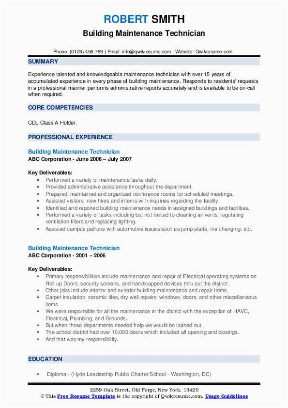 There are as a result many options for you as you search for the perfect sample resume for building maintenance technician, and subsequent to some difficult take action and perseverance upon your part, you will locate yourself next a first-class resume in no time, and hopefully, a first-class employer, as well!. For more guidance on resumes or for a sample resume for building maintenance technician checkout this recommended websites.