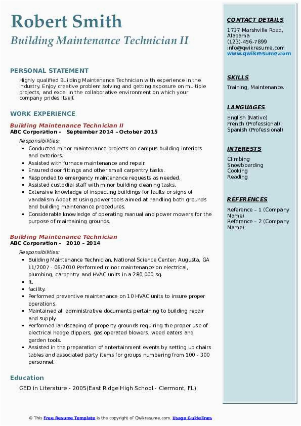 Building Maintenance Technician Resume Samples