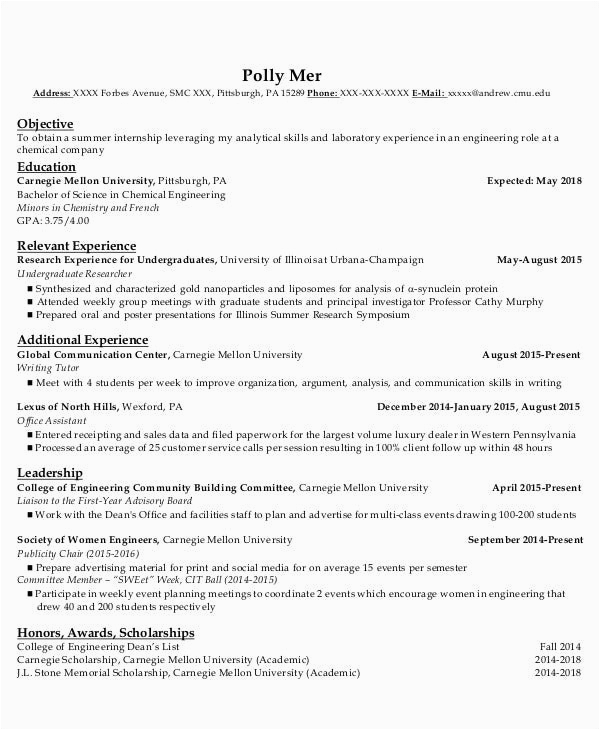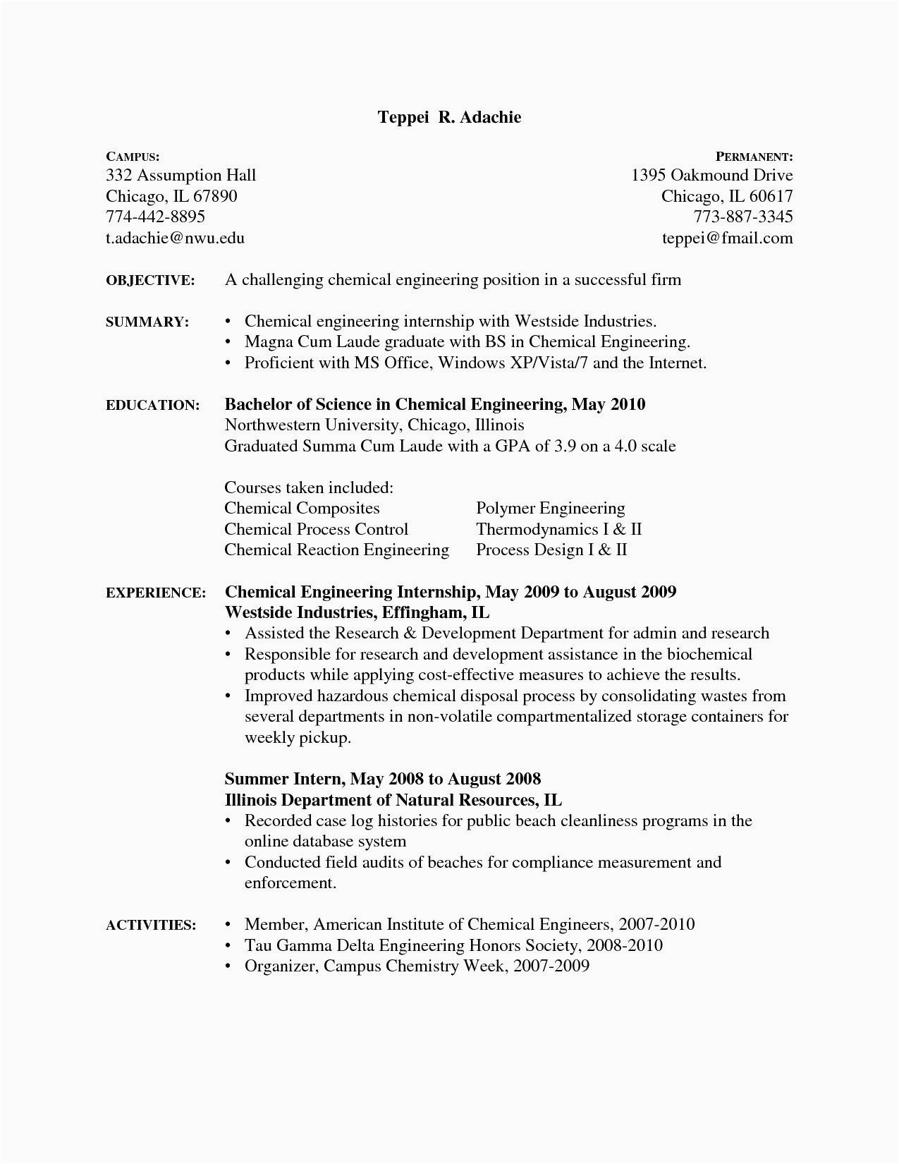However, these are not your deserted options for locating Sample Resume for Chemical Engineering Internship. Your speculative or university will most assuredly have more than one resume template that you can use, and will be happy to help you. handily head exceeding to their Placement Office and you will have a template in no time. After all, it is their job to put up to you locate employment, and taking into consideration you are affluent and a satisfied and beneficially employed former student, it is with a feather in their cap.