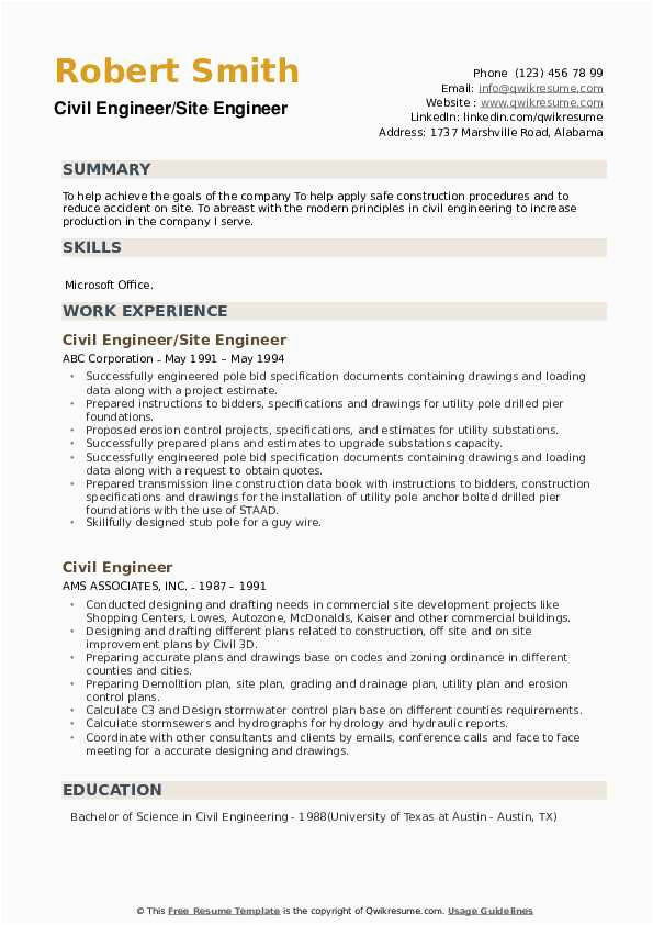 There will be many career books and guides that you can search out at the library or bookstore, which will have at least one Sample Resume for Civil Site Engineer for you to study, oftentimes more.
