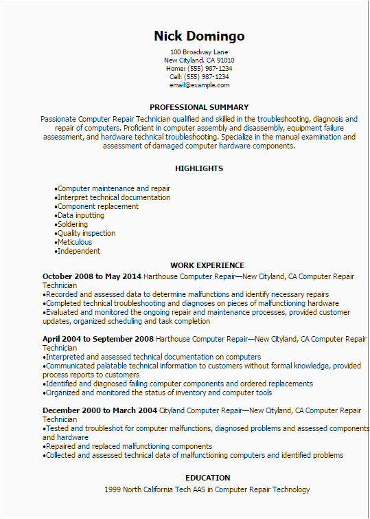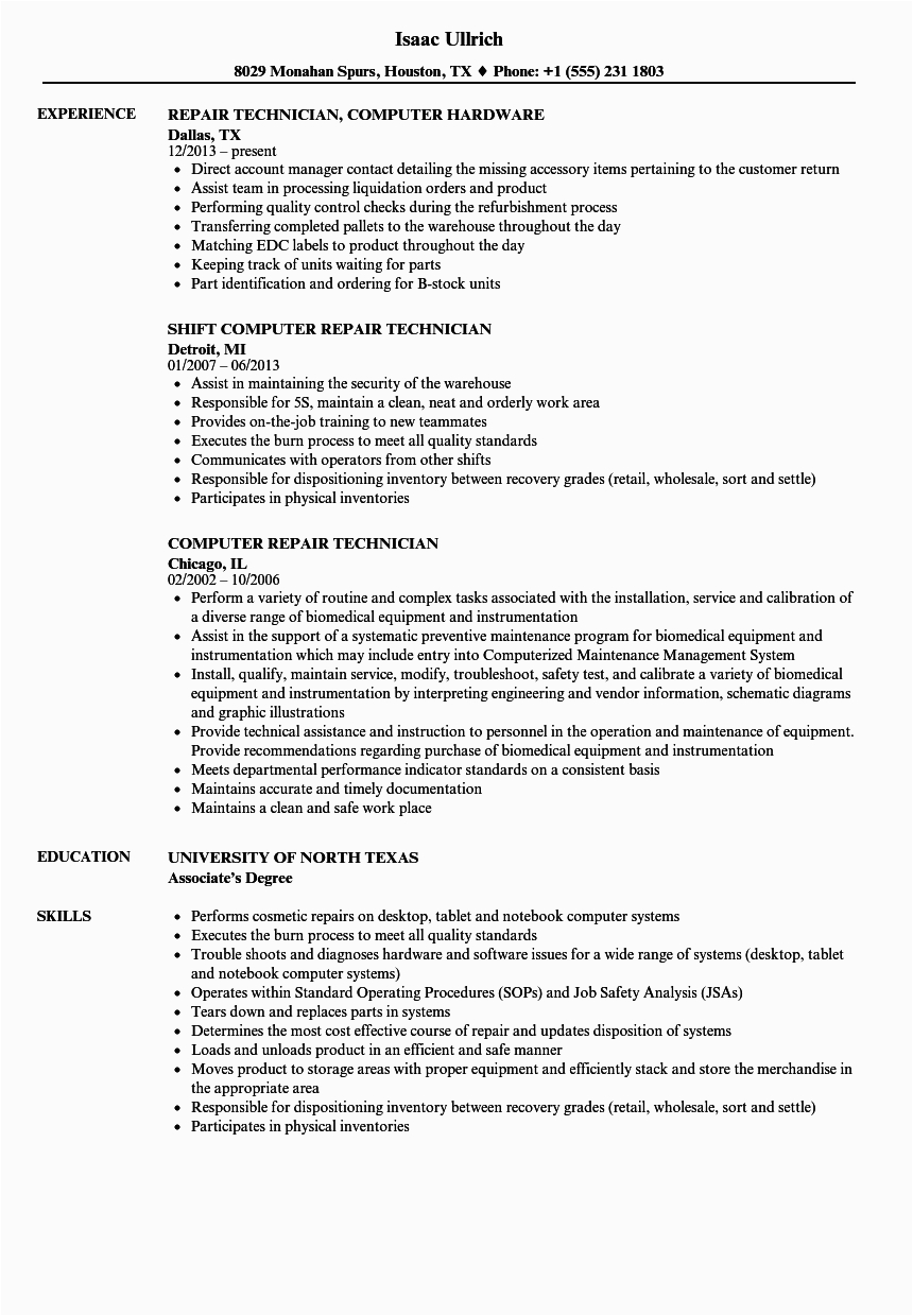 Subsequent to you are searching for the absolute job, you will of course want to put your best foot speak to behind an impressive and well-formatted resume. One showing off of assuring that you have such a resume is to download a sample resume for computer repair technician. These templates can find the money for you in the manner of the precise resume you are looking for or clearly use them as a guide to make your own.