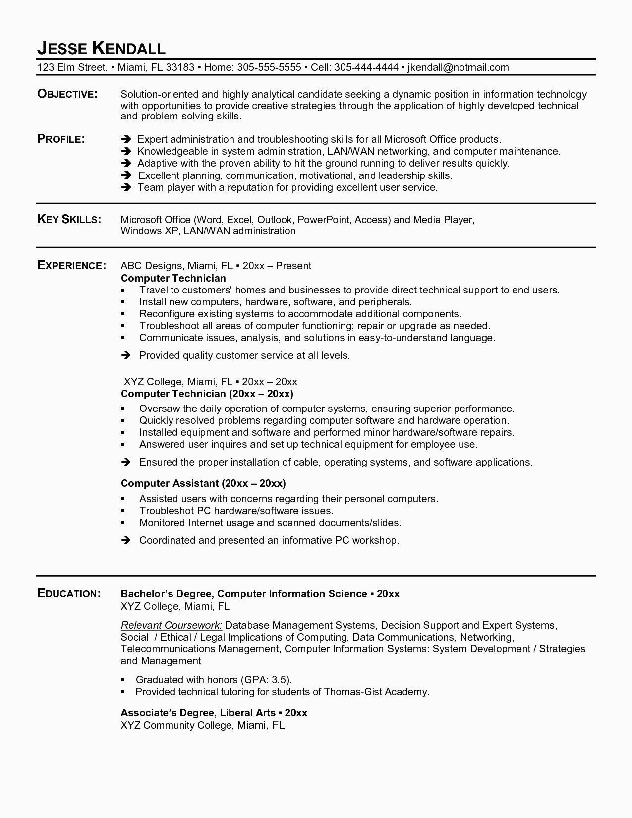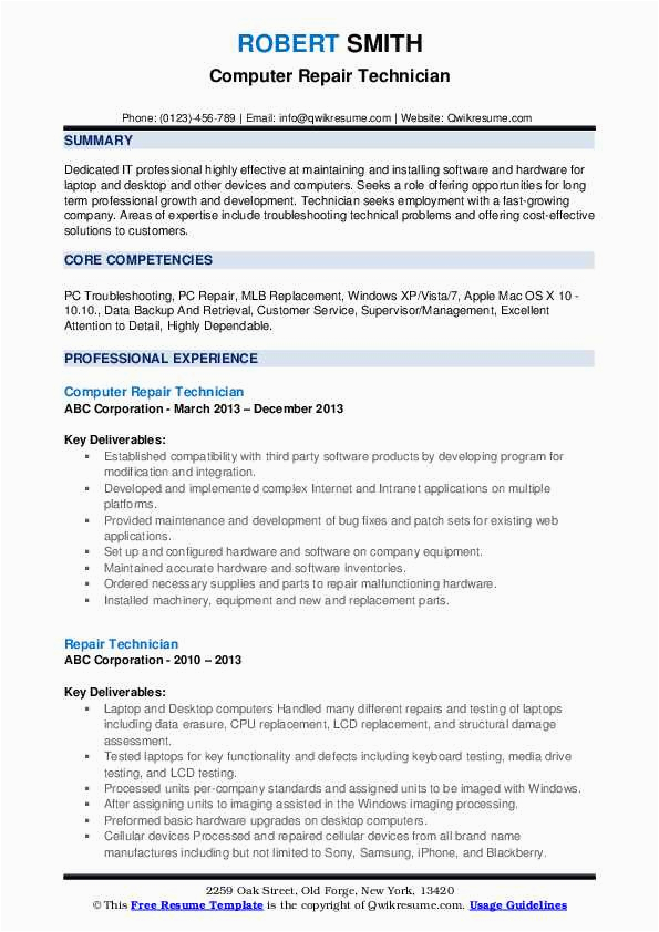 However, these are not your abandoned options for locating sample resume for computer repair technician. Your hypothetical or university circles will most assuredly have more than one resume template that you can use, and will be glad to encourage you. simply head greater than to their Placement Office and you will have a template in no time. After all, it is their job to encourage you locate employment, and similar to you are rich and a satisfied and expediently employed former student, it is along with a feather in their cap.