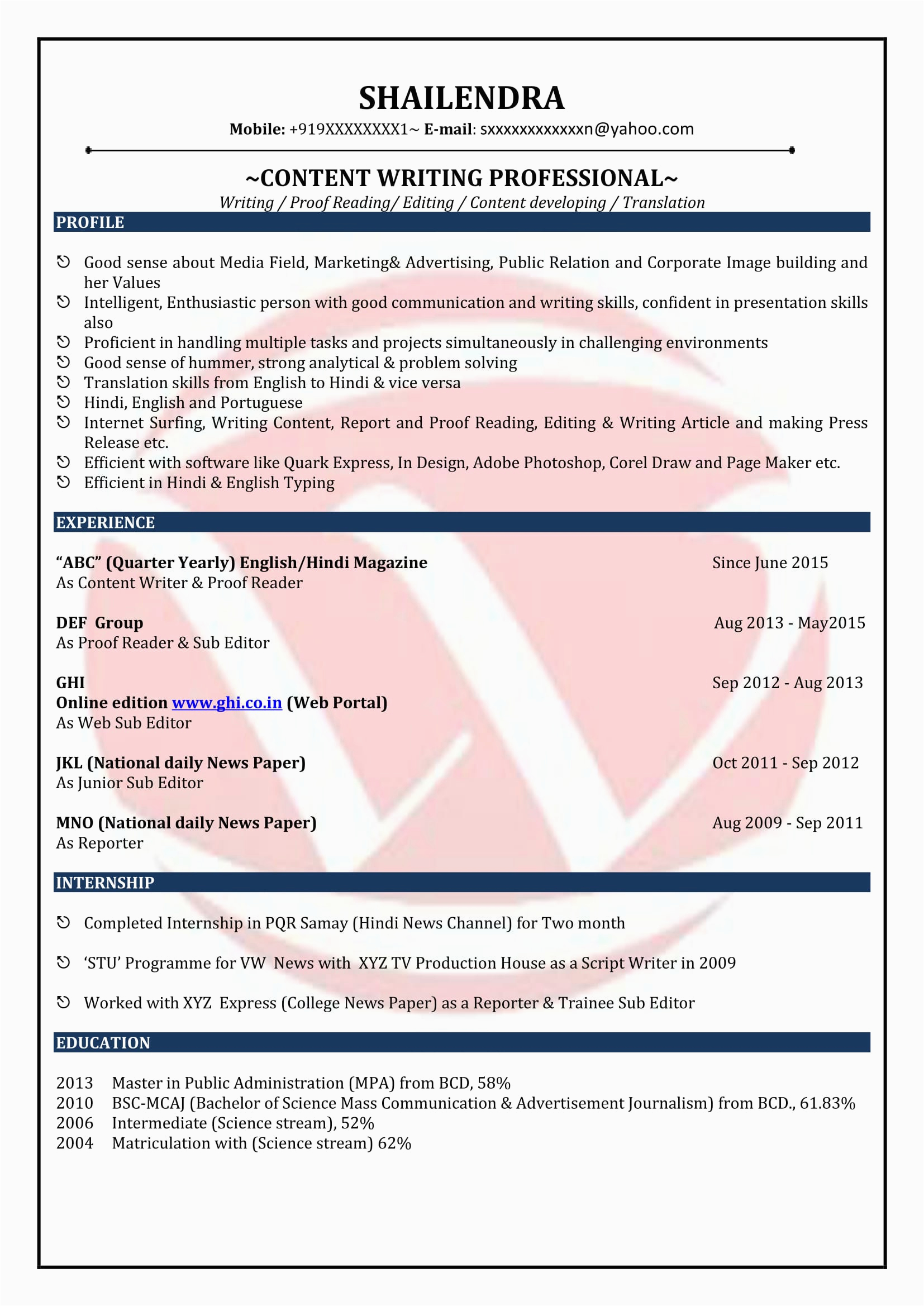 And for every website you come across that has a sample resume for content writer fresher, you will locate that there are specialized templates for just about any type of resume you hope to create. You can find a sample resume for content writer fresher for an entry-level position, and you can locate a template for just virtually any type of job or career you are looking for.