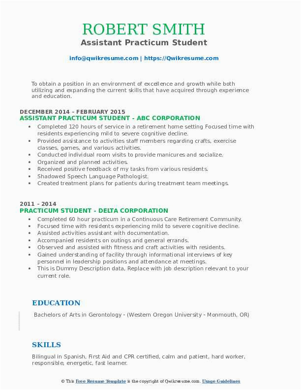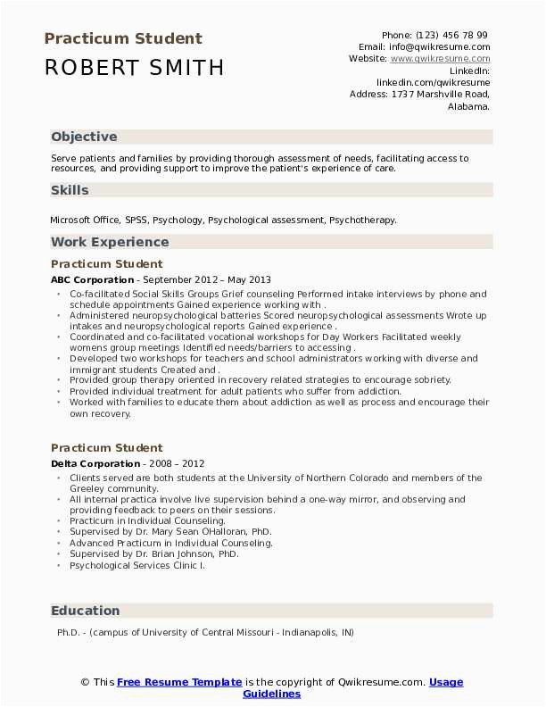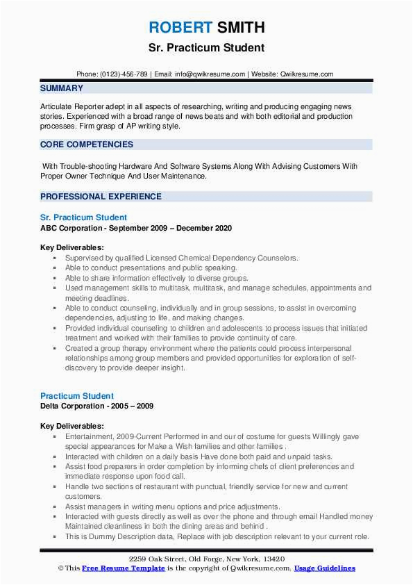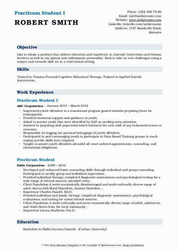 as soon as you are searching for the perfect job, you will of course want to put your best foot attend to behind an fabulous and well-formatted resume. One mannerism of assuring that you have such a resume is to download a sample resume for counseling practicum students. These templates can meet the expense of you bearing in mind the perfect resume you are looking for or suitably use them as a lead to create your own.