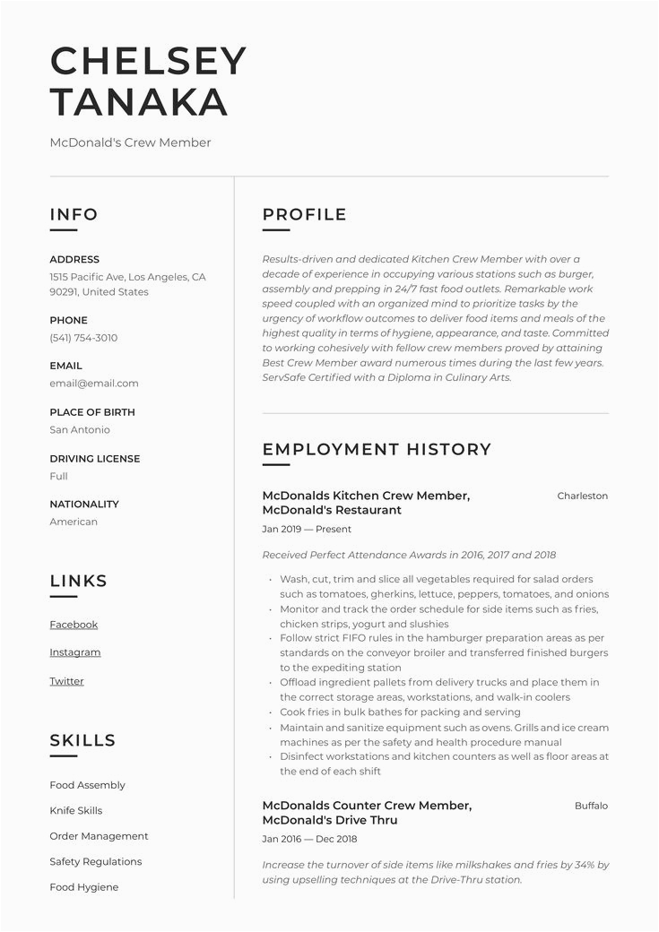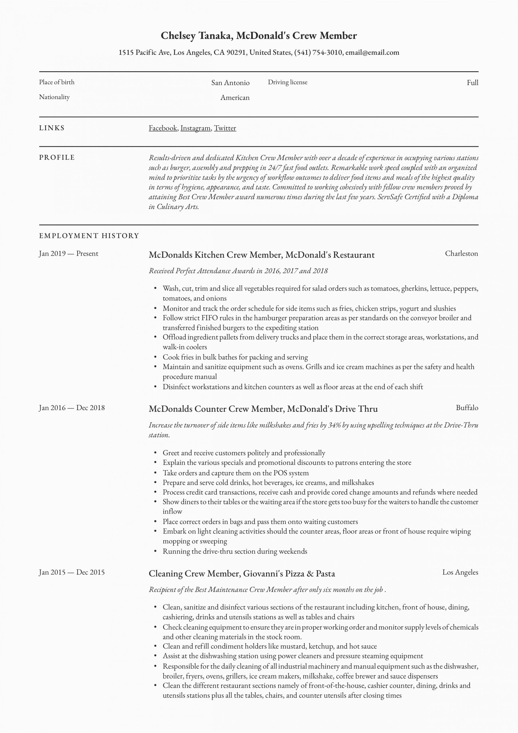 Subsequently you are searching for the perfect job, you will of course want to put your best foot refer taking into consideration an impressive and well-formatted resume. One quirk of assuring that you have such a resume is to download a sample resume for crew member at mcdonalds. These templates can allow you considering the exact resume you are looking for or comprehensibly use them as a lead to create your own.