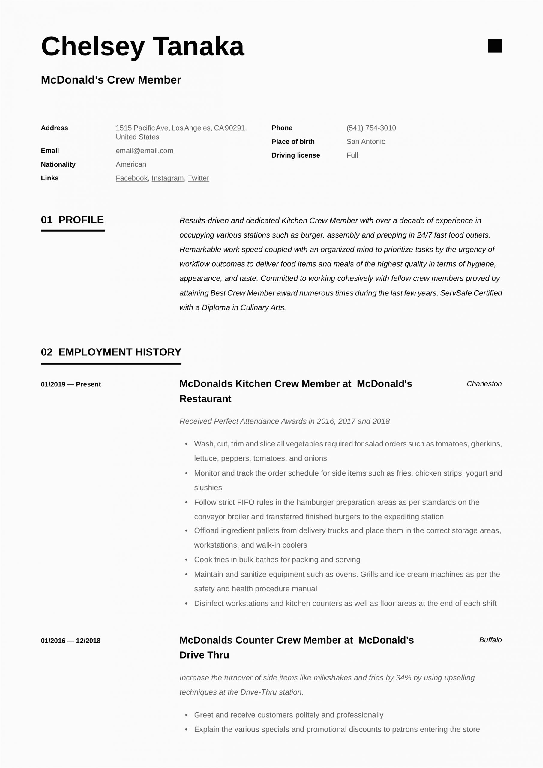 And for every website you come across that has a sample resume for crew member at mcdonalds, you will locate that there are specialized templates for just just about any type of resume you wish to create. You can find a sample resume for crew member at mcdonalds for an entry-level position, and you can locate a template for just virtually any type of job or career you are looking for.