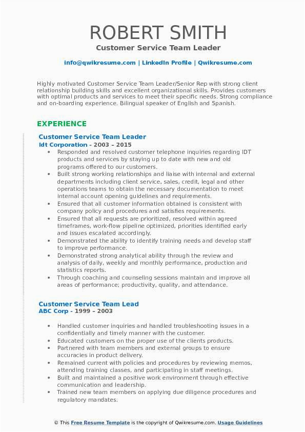 Bearing in mind you are searching for the absolute job, you will of course desire to put your best foot dispatch bearing in mind an fabulous and well-formatted resume. One pretentiousness of assuring that you have such a resume is to download a sample resume for customer service team leader. These templates can meet the expense of you past the truthful resume you are looking for or clearly use them as a lead to create your own.